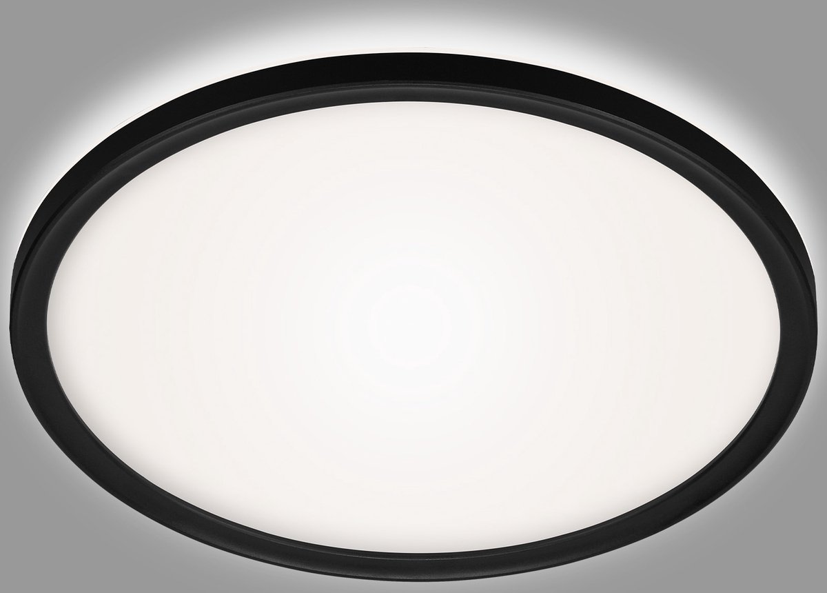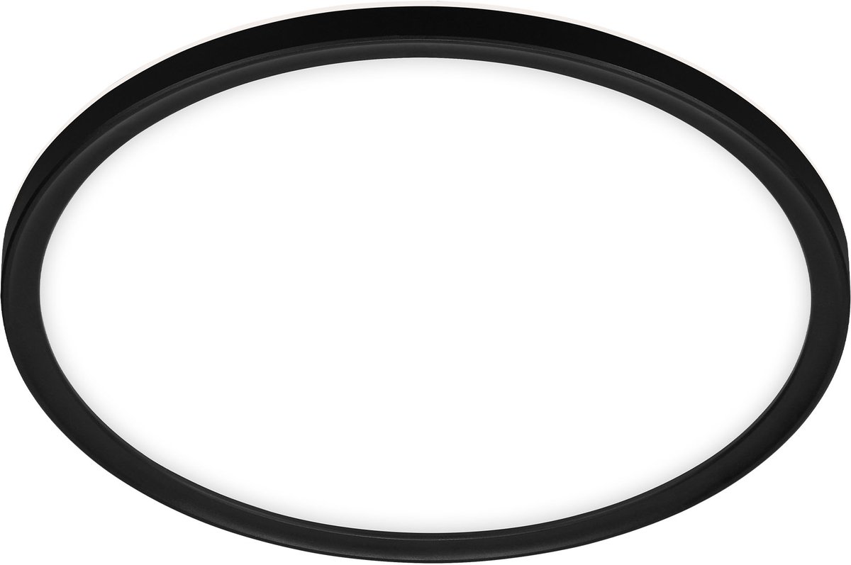 Materialen: de aanbieding noemt alleen een zwart frame en geïntegreerde LED-techniek; precieze materialen (metalen samenstelling, kunststof diffusor) zijn niet gespecificeerd. Gewicht en exacte afmetingen behalve de diameter zijn niet vermeld, dus houd rekening met een onbekende belasting op het plafond (Not listed).