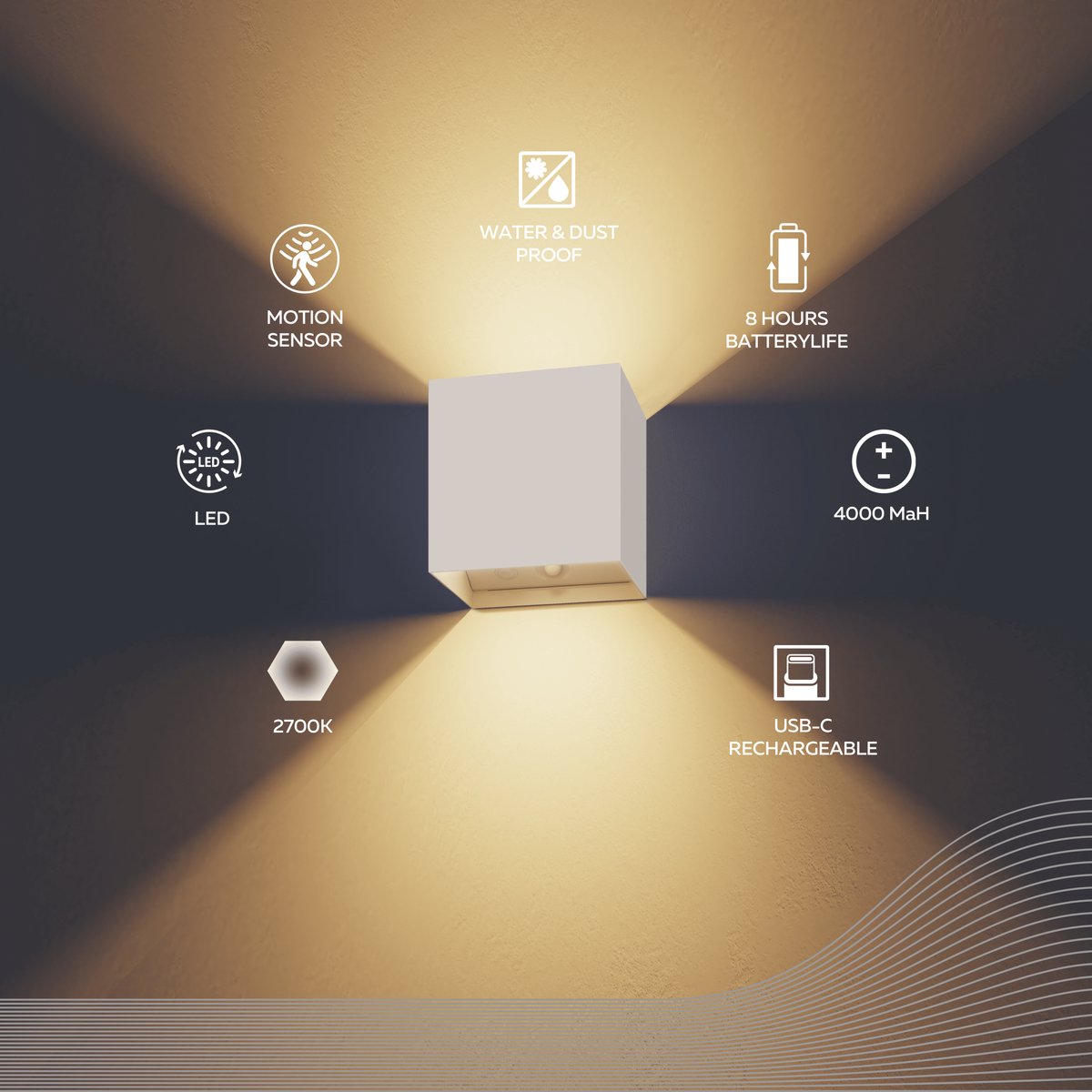 De grootste praktische eigenschap is dat de Calex Volterra oplaadbare wandlamp een ingebouwde oplaadbare batterij heeft. Dat betekent dat je geen vaste stroomaansluiting op de montageplek hoeft te hebben, wat installatie eenvoudiger en flexibeler maakt. Dit is vooral handig voor huurwoningen, bij tijdelijke buitenevenementen of als je naadloos verlichting wilt toevoegen zonder hak‑ of breekwerk.