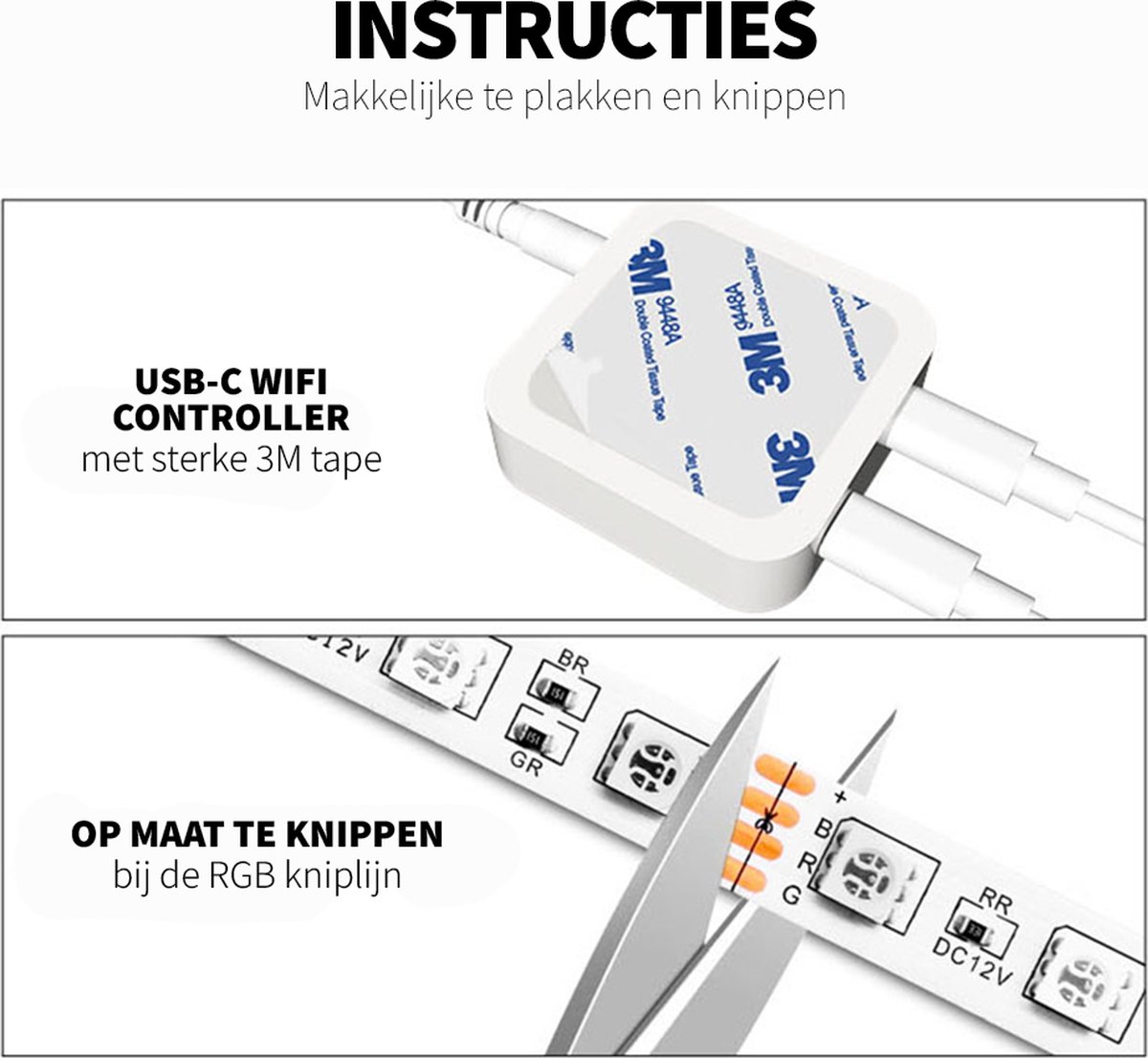 De strip werkt met de gratis Tuya Smart home APP en wordt geleverd met een controller. Via de app kun je kleuren kiezen, scenes instellen en de verlichting op afstand beheren.