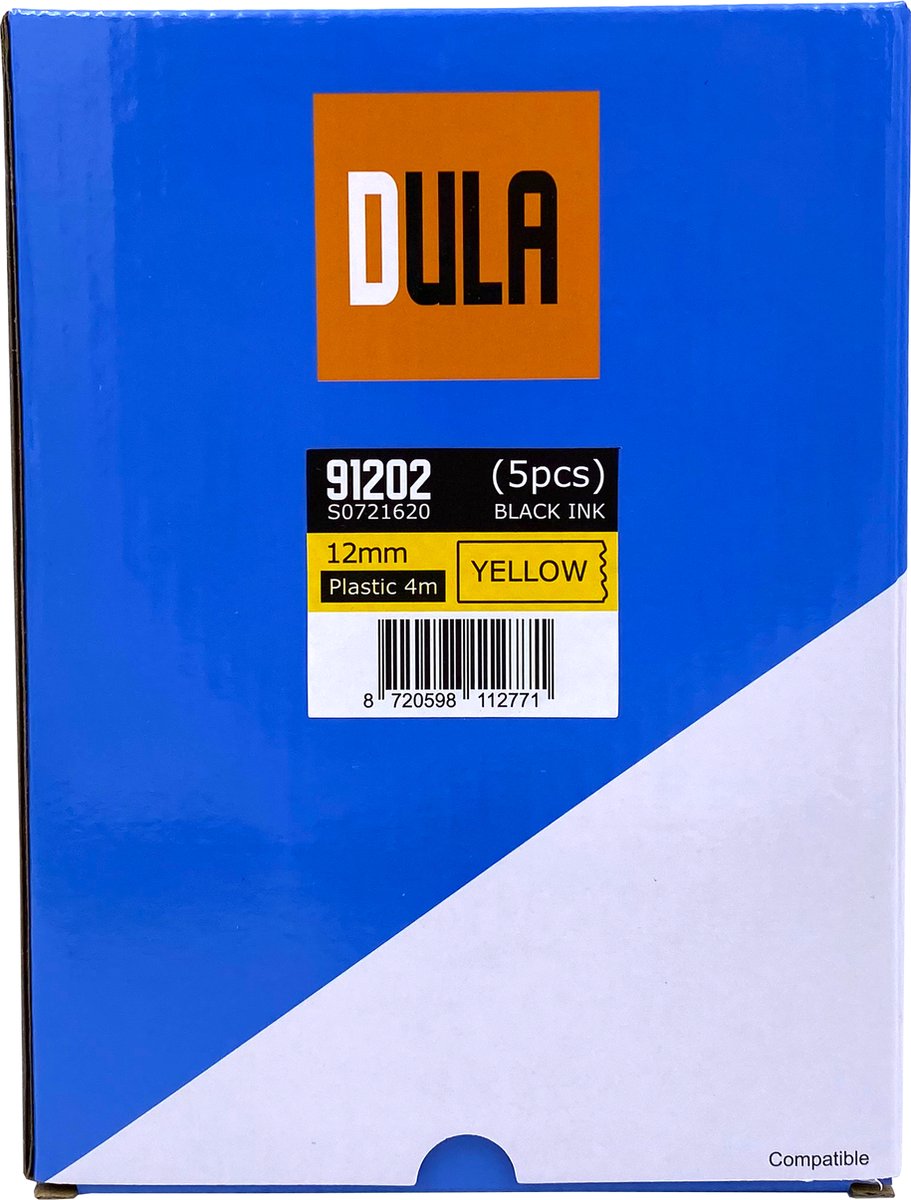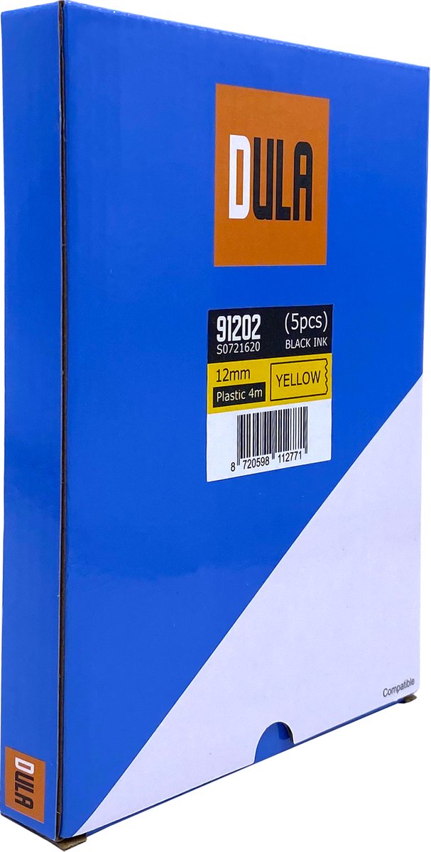 De DULA 91202 / S0721620 labeltape is een gele, gelamineerde plastic tape bedoeld voor gebruik in Dymo LetraTag labelprinters. Met een breedte van 12 mm en een rol van 4 meter levert deze tape duidelijke zwarte tekst op een contrasterende achtergrond — geschikt voor algemene markering in huis, kantoor of magazijn.