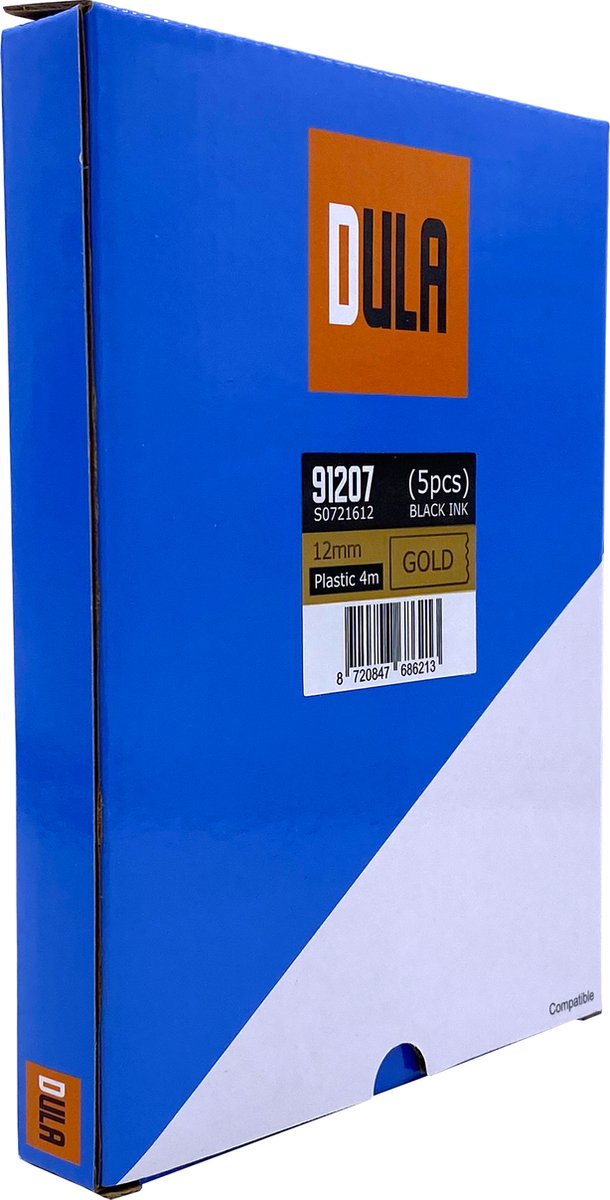 De DULA 91207 is een vervangende labeltaperol bedoeld voor compacte labelprinters. Het product (ook vermeld als S0721612) levert een goudkleurige kunststof tape met zwarte bedrukking en een permanente lijmlaag. Met een breedte van 12 mm en een lengte van 4 meter is het een standaardoptie voor zichtbare, duurzame labels.