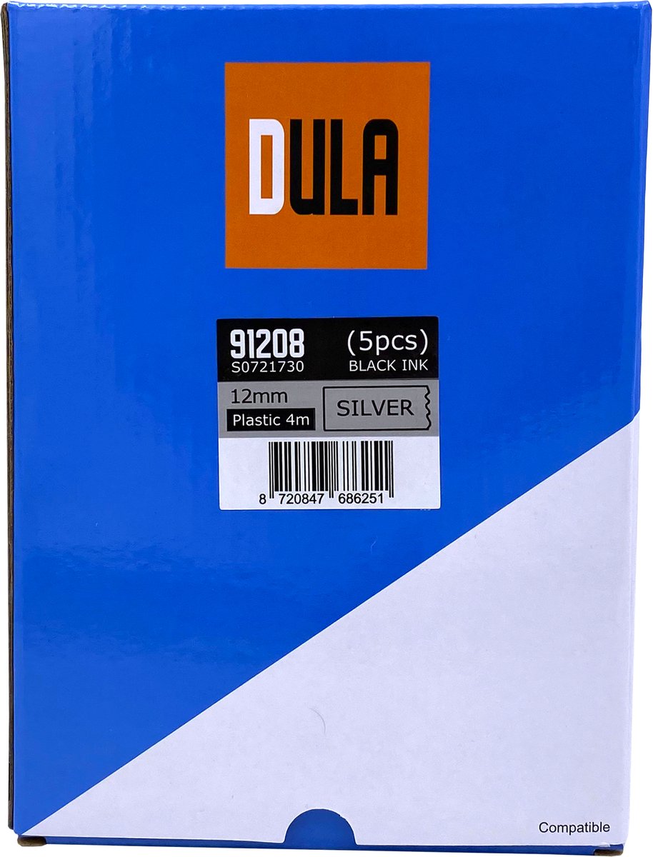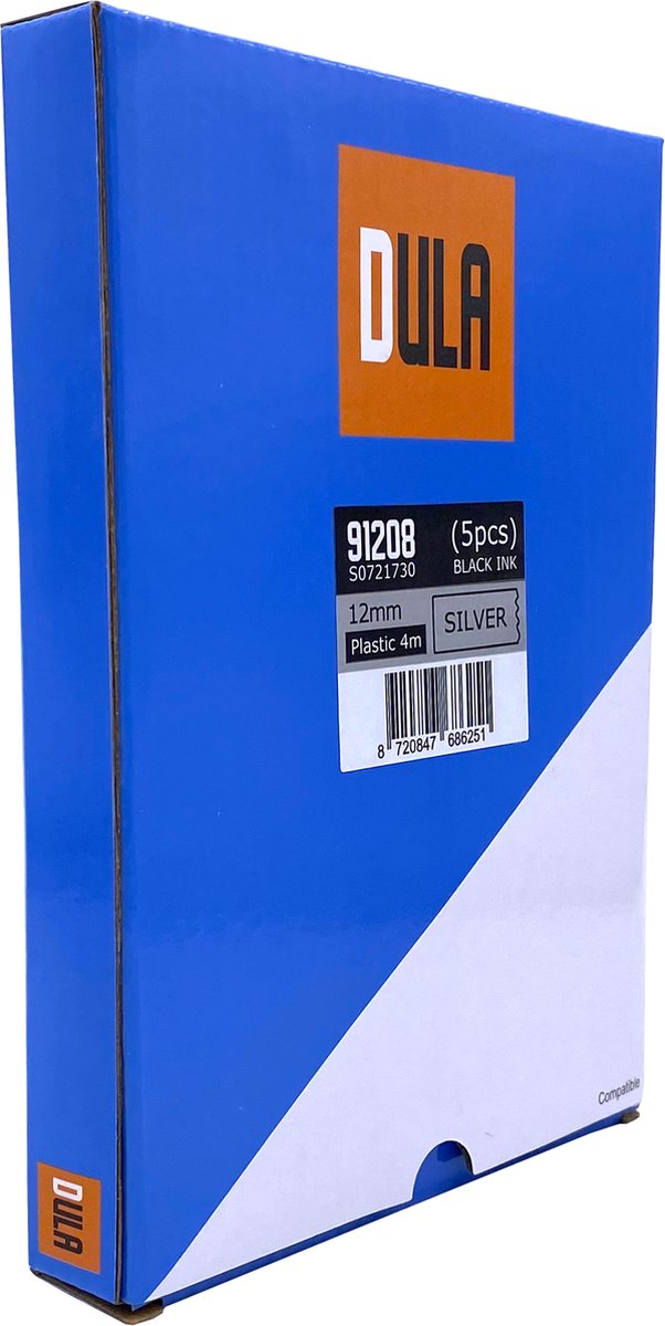 Overzicht:De DULA 91208 is een zilveren plastic etikettape, ideaal voor Nederlandse huishoudens en kantoren die duurzame, duidelijke labels willen. Compatibel met Dymo LetraTag-etikettenprinters.