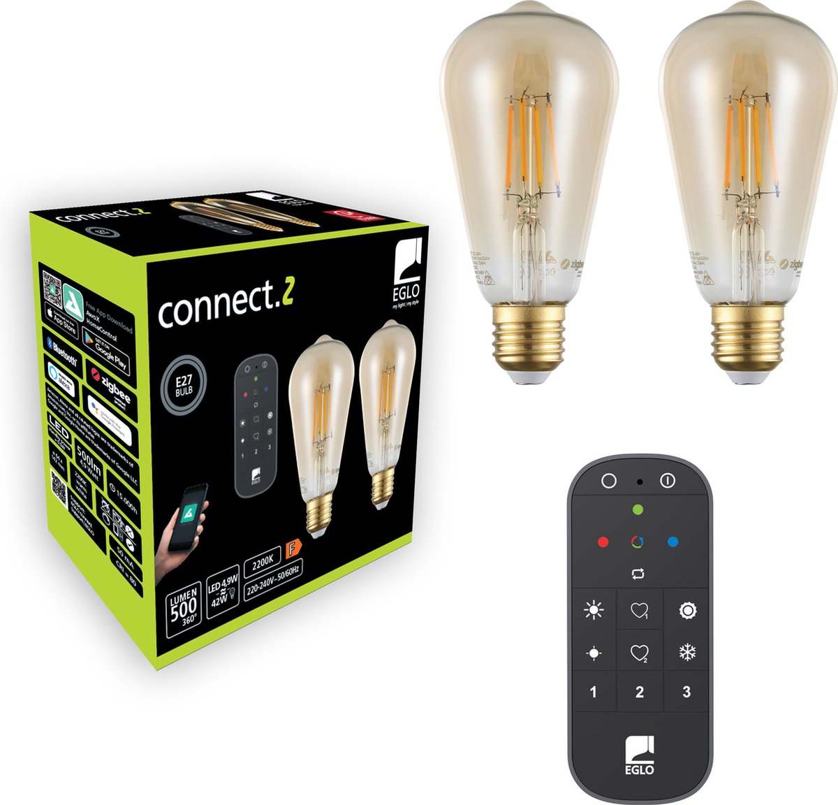 Het EGLO connect.z starterspakket is een basisset voor slimme verlichting met twee dimbare LED-lichtbronnen (E27) en een afstandsbediening. De set maakt slimme aansturing mogelijk via de gratis app (iOS en Android), de meegeleverde afstandsbediening en spraakbesturing via compatibele assistenten. Dit pakket is bedoeld voor wie snel en zonder technische fratsen wil beginnen met huisautomatisering en sfeerverlichting.