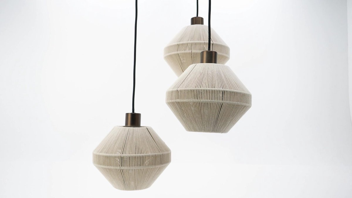 De combinatie van staal (voor de structuur) en textiel (voor de kappen) levert zowel stabiliteit als een warme uitstraling. Staal zorgt voor een solide ophanging; textiel voorkomt harde reflecties en draagt bij aan de Japandi-esthetiek.