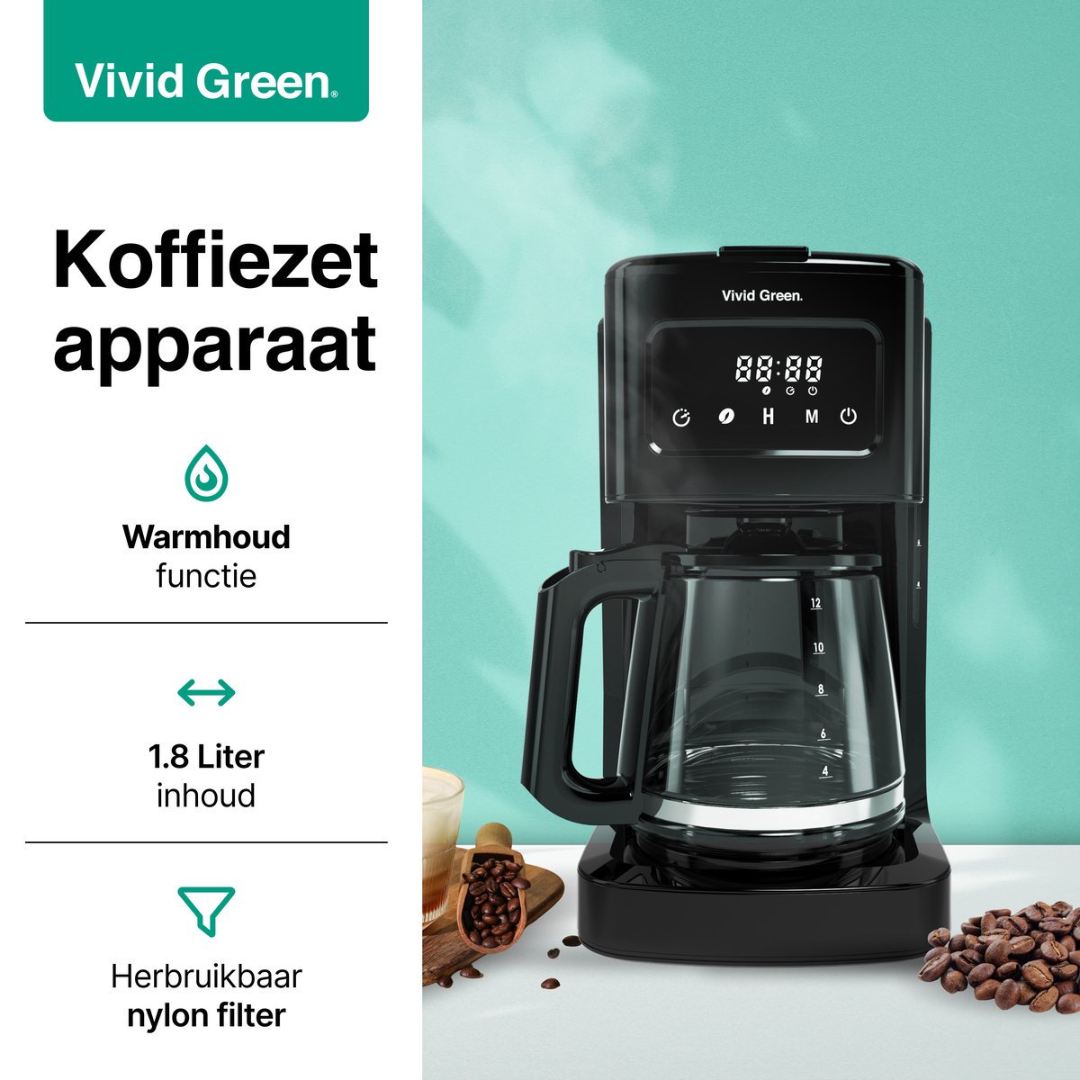 Het Vivid Green Koffiezetapparaat is een filterkoffiezetter met moderne bediening en een aantal slimme functies die het dagelijkse koffiezetten makkelijker moeten maken. Met een capaciteit van 1,8 liter zet je tot 12 kopjes in één keer, terwijl een digitaal touchscreen en een timer zorgen voor gebruiksgemak. (bron: listing, gecontroleerd 2025)