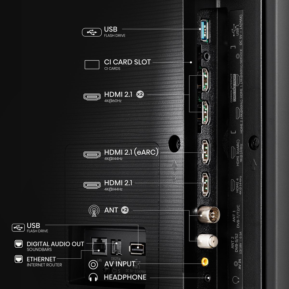 | 144 Hz spelmodus met VRR, ALLM en AMD FreeSync Premium voor zeer vloeiende en responsieve gaming (volgens fabrikant) | Aantal HDMI-poorten, eARC en exacte poortspecificaties niet vermeld, lastig voor complexe set-ups |