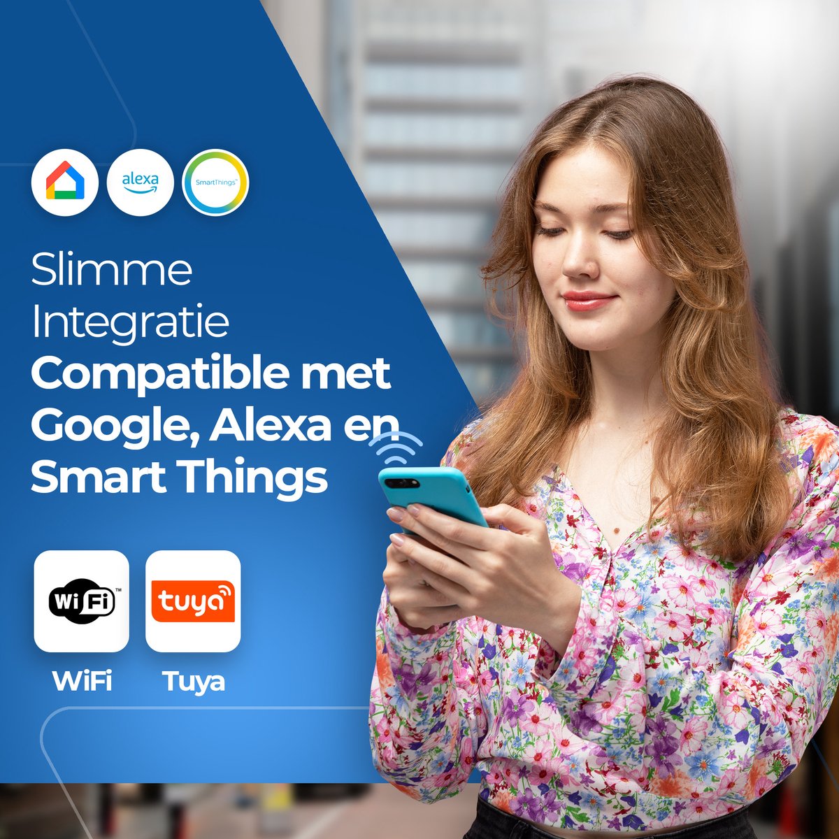 - Bedien apparaten op afstand via app; compatibel met Google Home en Amazon Alexa