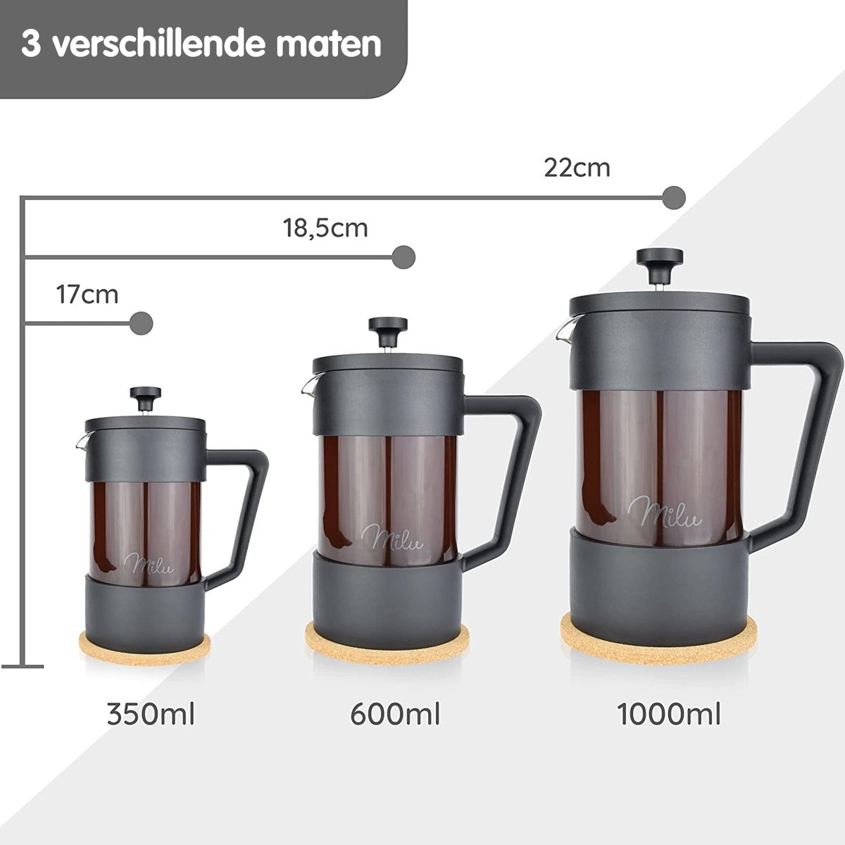 De capaciteit van 350 ml maakt deze Milu French Press geschikt voor één tot twee personen (bron: productpagina, gecheckt 2025). Voor woningen of werkplekken waar je snel twee kopjes tegelijk wilt zetten is dat heel praktisch. Let op: als je grotere kannen prefereert of vaak voor meer mensen zet, is deze inhoud mogelijk te klein.