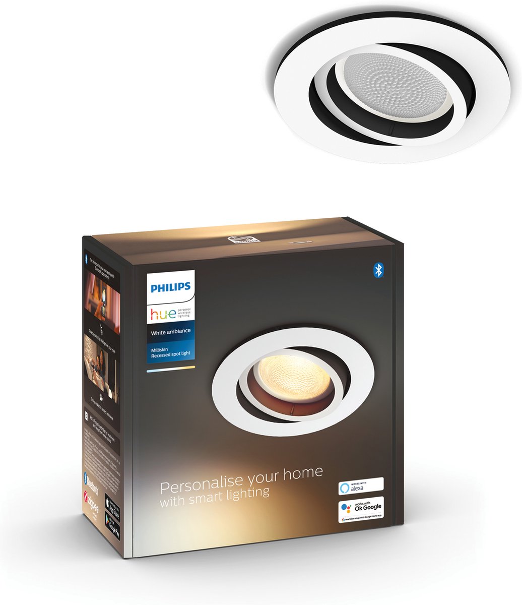 De Philips Hue Milliskin is een inbouwspot uit de Hue-familie met een strak, rond wit uiterlijk en een centraal richtbare spot, omlijst door een dunne zwarte rand. De lamp gebruikt de White ambiance LED-techniek en levert lichtvariaties van warm tot koel wit. De spot is bedoeld voor wie een discrete, verstelbare inbouwverlichting zoekt die eenvoudig draadloos te bedienen is.