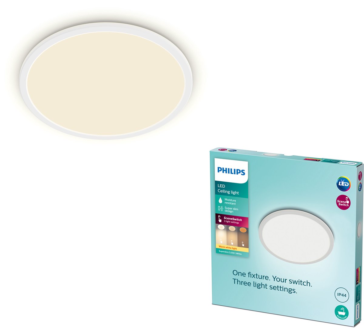 Overzicht:De Philips SuperSlim LED-plafondlamp is een ultradunne plafondlamp die in Nederlandse badkamers eenvoudig de juiste sfeer creëert. Met EyeComfort voor aangenaam, flikkervrij licht en een verbruik van 18 W geniet je van efficiënte, comfortabele verlichting.