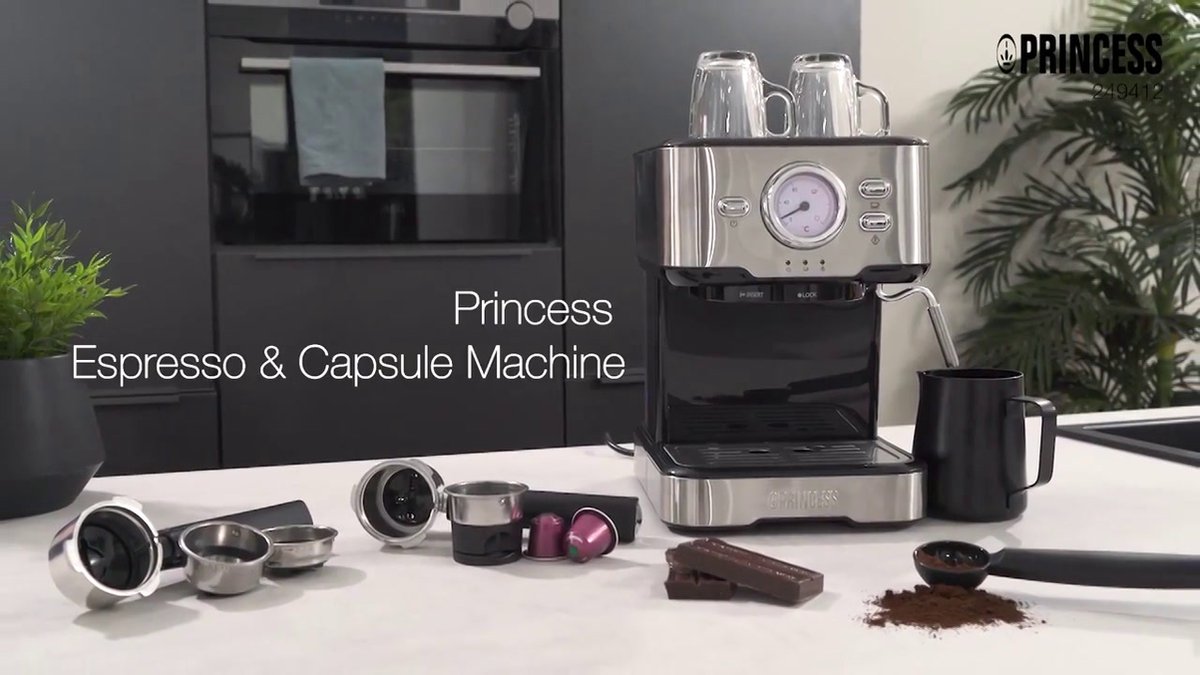 De Princess 249412 Espressomachine is een compacte espressomachine voor thuisgebruik die belooft krachtige espresso en melkspecialiteiten te leveren met een relatief eenvoudige bediening. Het apparaat beschikt over een 20 bar pomp, een stoompijpje voor melkschuim en meerdere inzetfilters, waardoor je zowel losse gemalen koffie als cups kunt gebruiken.