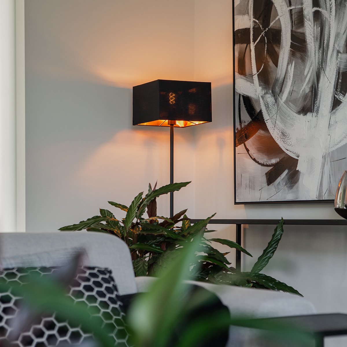 De Vloerlamp VT 1 is een vrijstaande sfeerlamp met een klassieke, toch moderne uitstraling. De buitenzijde is mat zwart, terwijl de binnenzijde een warme gouden kleur heeft die het licht zachter en uitnodigender maakt. Dit maakt de lamp geschikt voor woonkamers, leeshoeken of hotelachtige sfeerplekken in huis.