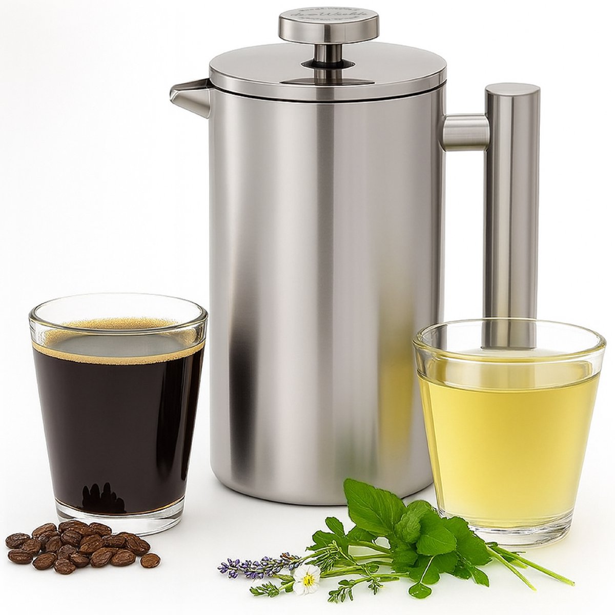 Overzicht:Deze french press is een dubbelwandige roestvrijstalen koffiezetter, perfect voor Nederlandse huishoudens die gemak en duurzaamheid waarderen. Met 1 liter inhoud en een ultra-fijn roestvrijstalen filter zet je tot zes kopjes, blijft de drank langer warm en is hij eenvoudig schoon te maken.