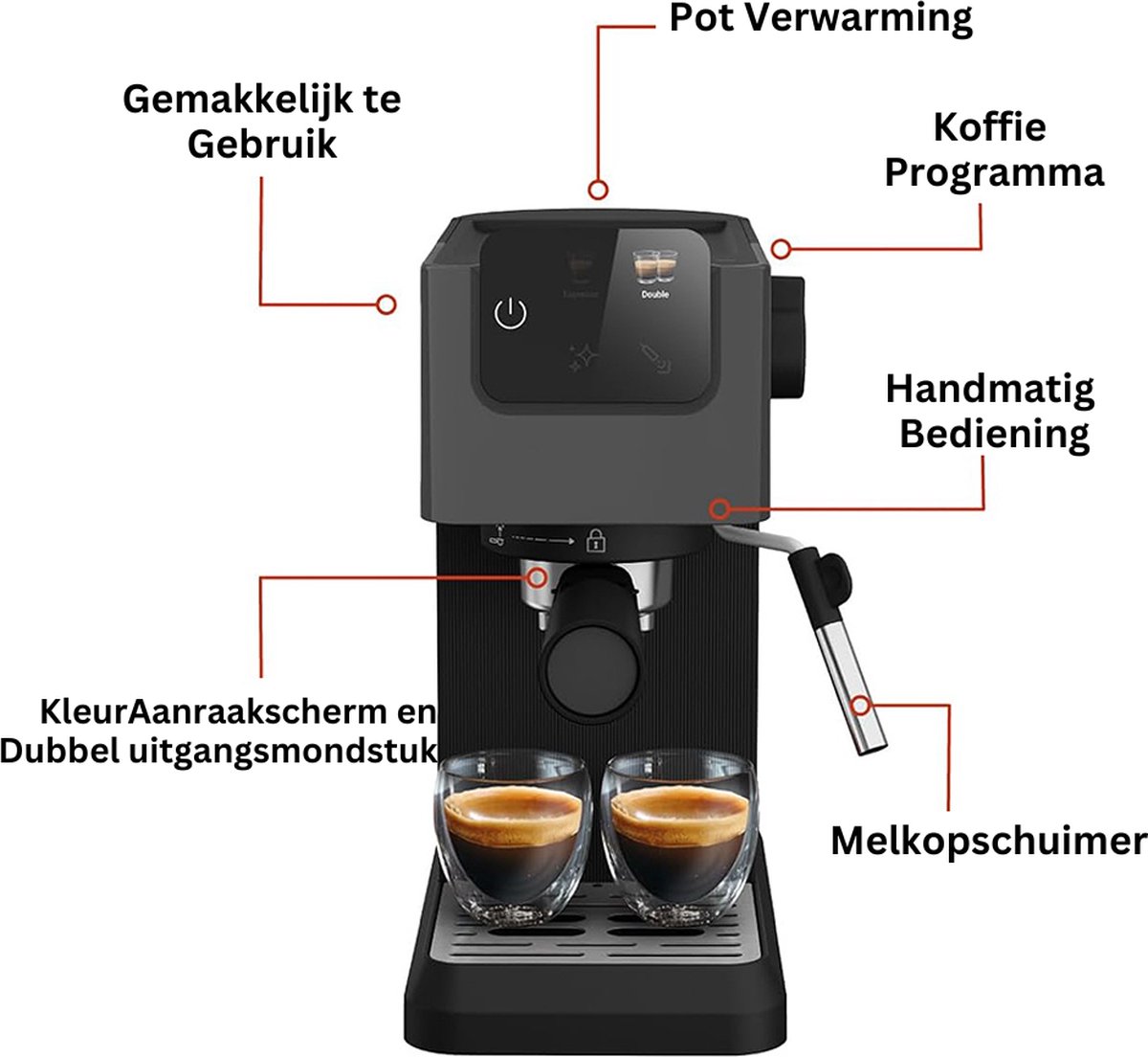 De tekst noemt een “professionele espressomachine” als uitgangspunt. Dat suggereert dat het apparaat is bedoeld voor gebruikers die een stapje hoger willen dan een basisapparaat. In de praktijk betekent dit dat je waarschijnlijk functies krijgt die meer controle of een betere kop geven dan een simpele filterkoffiezetter. Voor thuisbarista’s is dit relevant bij het leren doseren, malen en tampen van koffie voor een rijkere kop. Let op: welke precieze bedieningselementen aanwezig zijn, wordt niet genoemd in de listing (Not specified).