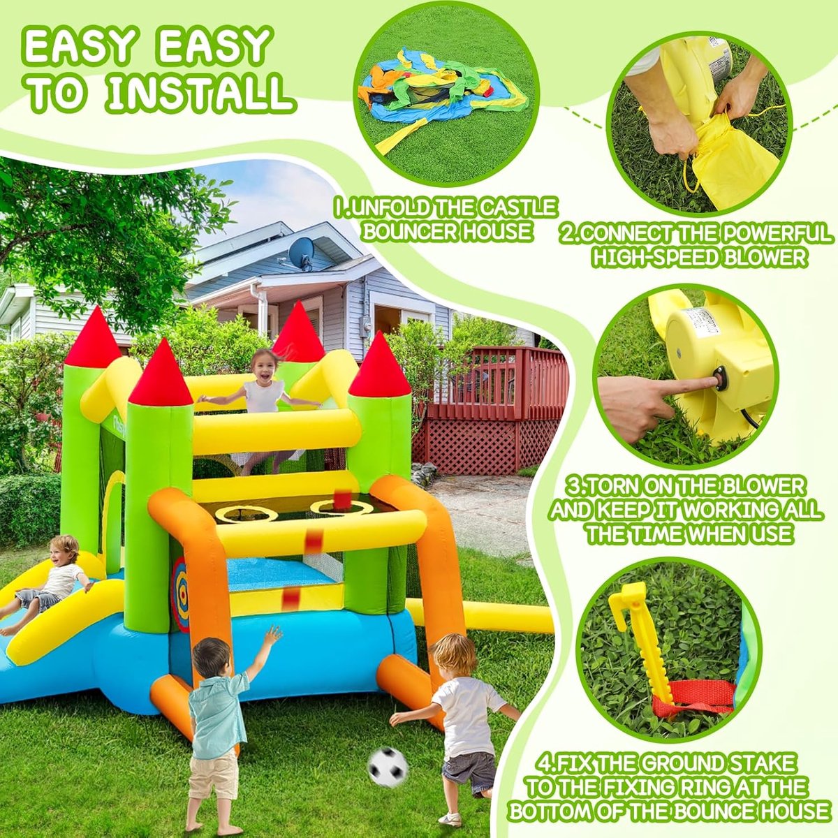 De meegeleverde ventilator (blower) maakt het mogelijk om het springkasteel in enkele minuten op te blazen en speelklaar te hebben. Dit model claimt snelle installatie zonder specialistische hulpmiddelen.