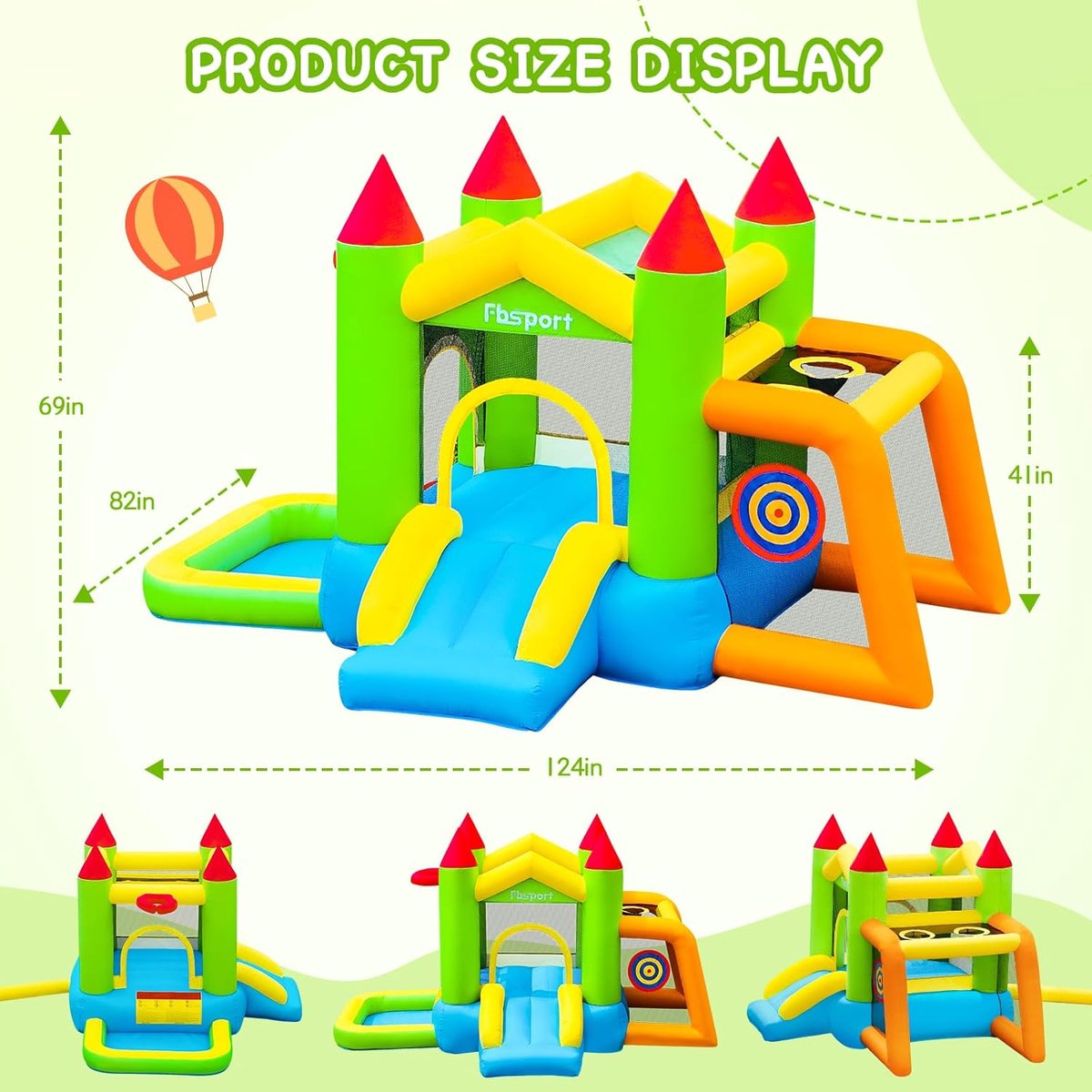 Dit product is een multifunctioneel opblaasbaar speelveld dat speeltijd combineert met beweging: een opblaasbaar springkasteel dat meerdere speelzones biedt, zoals een springvlak, een ballenbad, een voetbalgebied en een basketbalring. Het is ontworpen voor gebruik binnen en buiten en wordt geleverd met accessoires en een ventilator waarmee je het snel klaarmaakt voor gebruik.