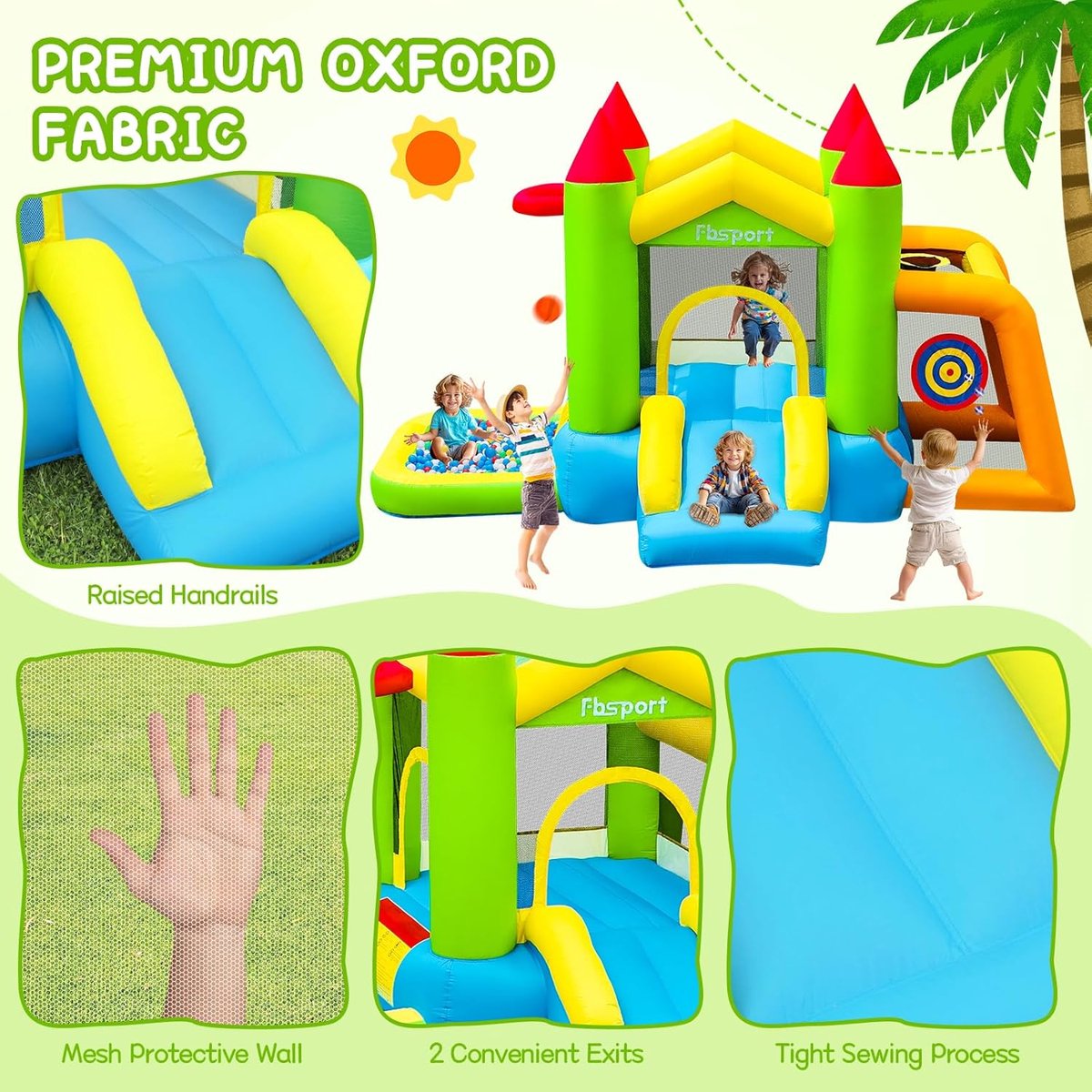 Het doelgroep zijn gezinnen met jonge kinderen die thuis willen spelen tijdens verjaardagen, weekendactiviteiten of gewoon dagelijks bewegingsplezier. De constructie gebruikt een stevige Oxford-stof en het ontwerp bevat ventilatie/open gedeelten om het spelen veiliger en aangenamer te maken. Kort oordeel: een complete speeloplossing voor jonge kinderen die veel afwisseling en bewegingsmogelijkheden wil bieden; goed qua prijs-kwaliteit voor incidenteel en seizoensgebonden gebruik.