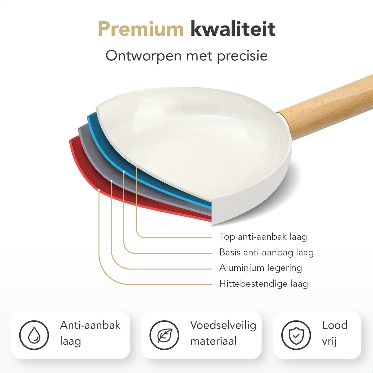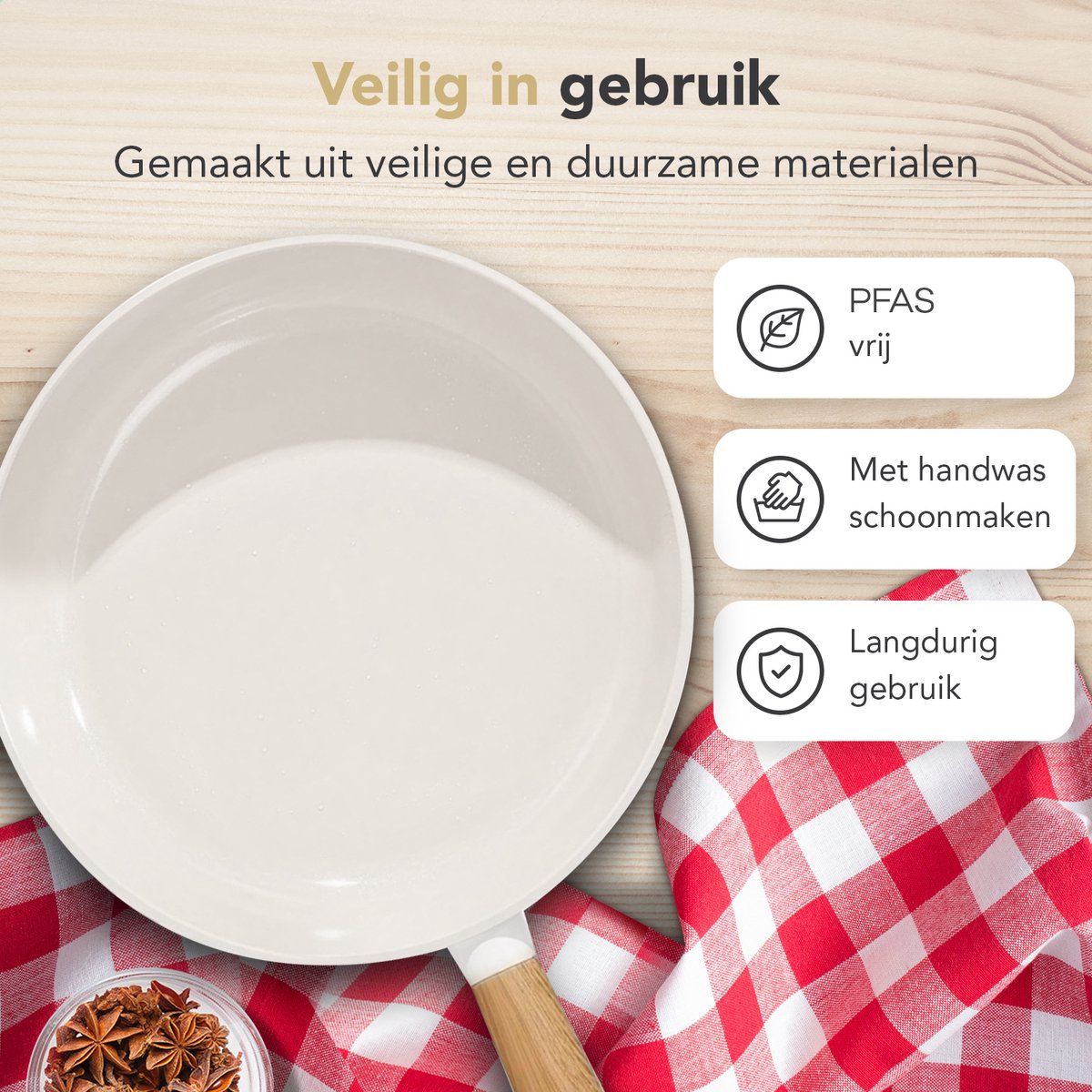 • Vetgebruik: dankzij de PFAS-vrije keramische coating kun je met minder vet koken; een klein scheutje olie of boter is meestal voldoende.