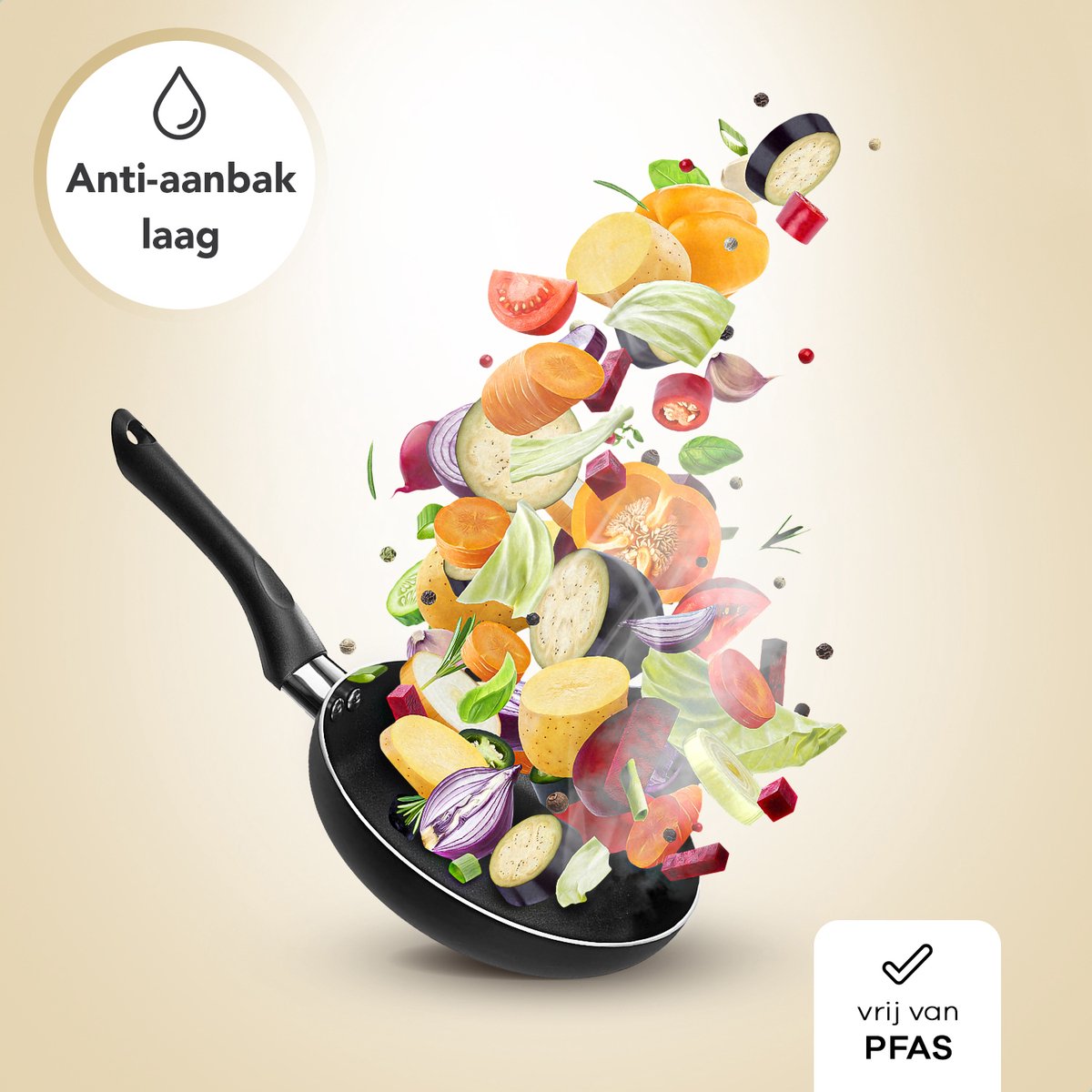 PFAS-vrije keramische anti-aanbaklaag, minder vet nodig en makkelijker schoon te maken (source: listing, checked 2025) Niet vermeld of vaatwasserbestendig — handwas wordt aanbevolen voor langere levensduur