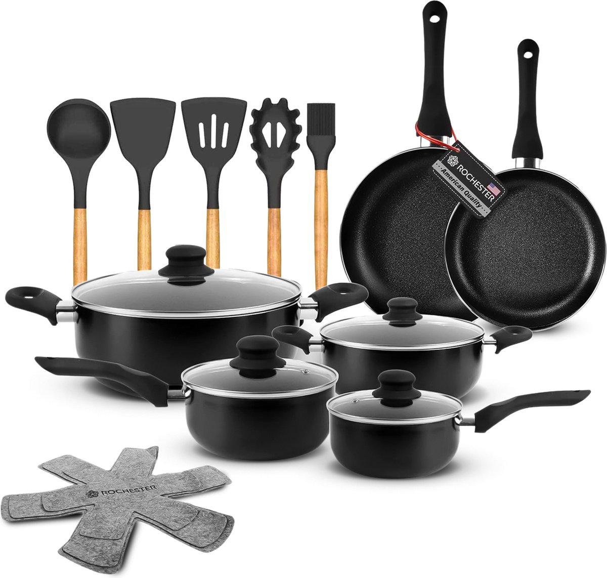 De Rochester 18-delige pannenset is een complete keukenset met koekenpannen, steelpannen, kookpotten, bijbehorende deksels, kookgerei en pannenbeschermers. De set richt zich op huishoudens die een uitgebreide, gebruiksklare collectie pannen willen zonder meteen losse onderdelen te moeten aanschaffen.