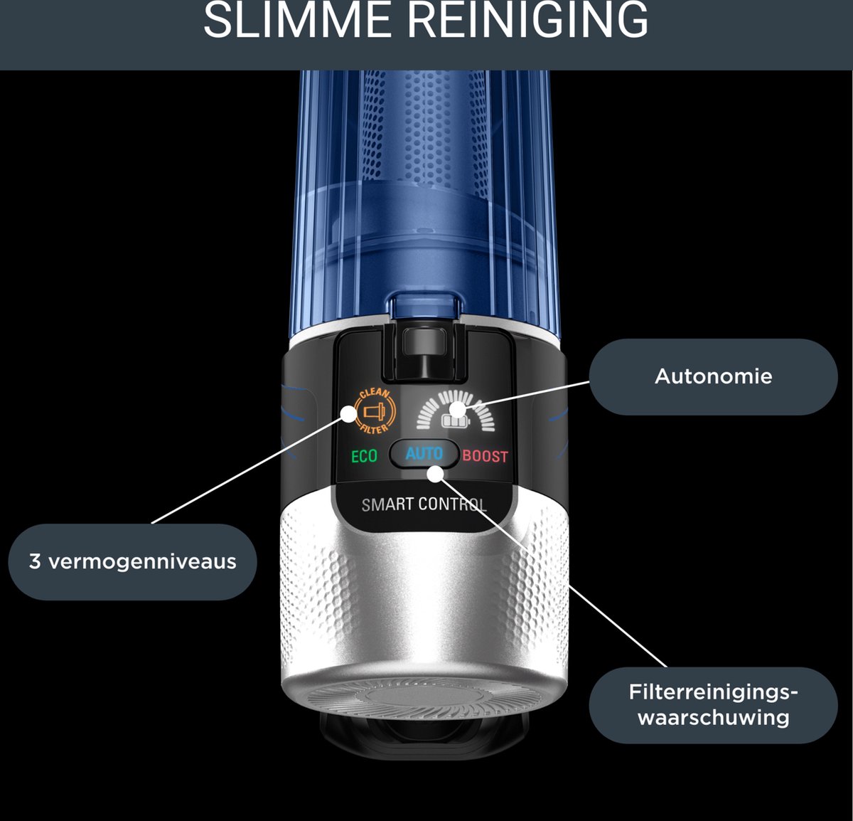 Het slimme bedieningsscherm toont realtime de resterende batterij, onderhoudsmeldingen zoals filterreiniging en geeft toegang tot meerdere vermogensniveaus plus een extra krachtige stand via de boostknop. Dergelijke feedback maakt het dagelijks gebruik intuïtief: je weet waar je aan toe bent en wanneer je iets moet schoonmaken of opladen. Minder giswerk, meer grip.