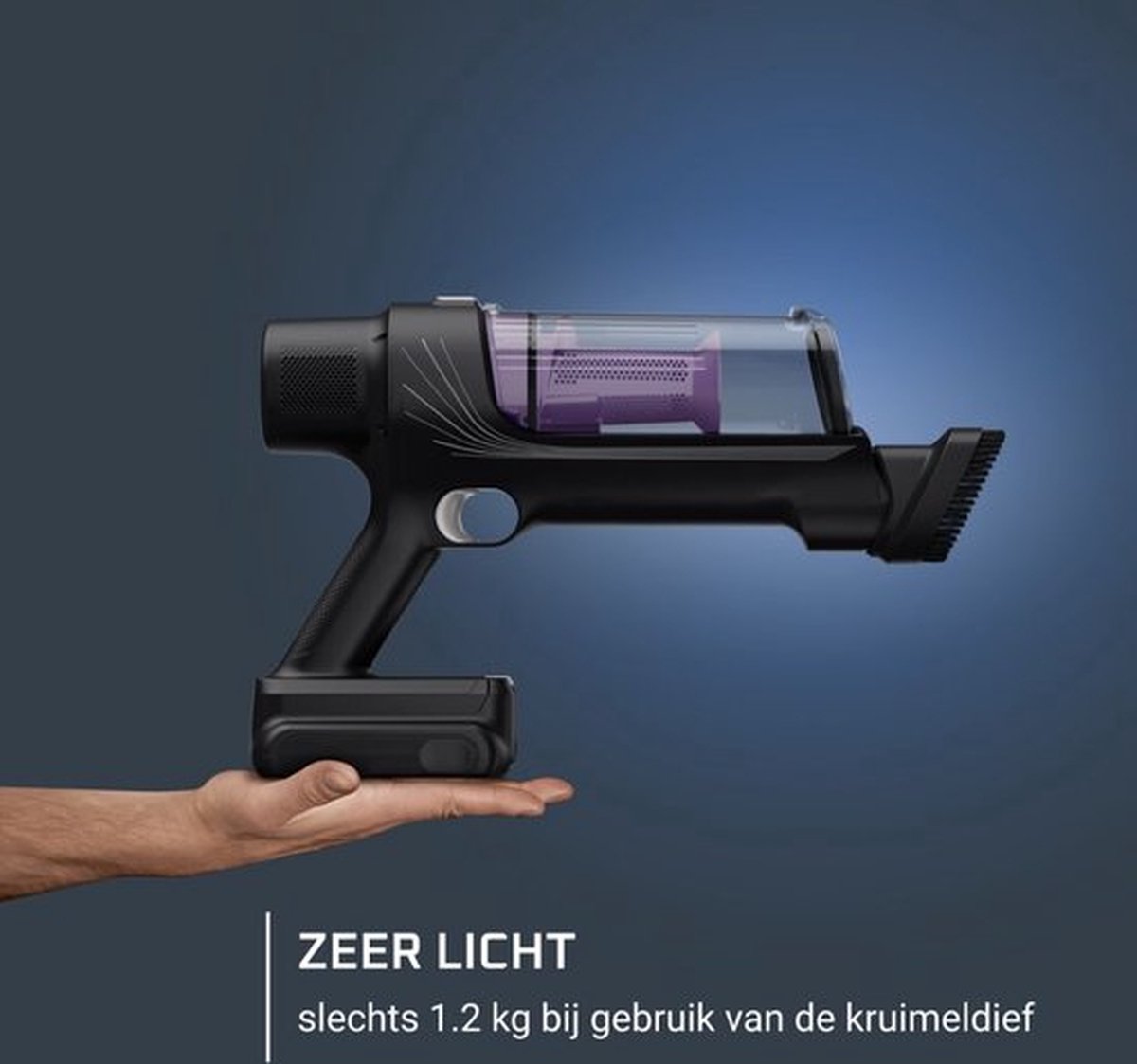 Lichtgewicht is hét kernargument van deze steelstofzuiger. 2 kg als steel en 1,2 kg als kruimelzuiger is écht weinig. Dat merk je bij: