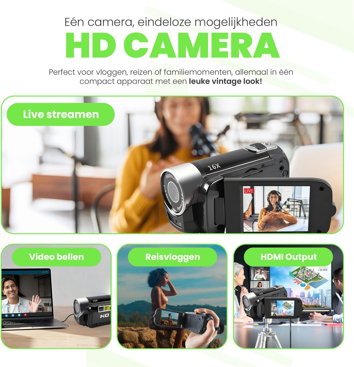 Extra opnamefuncties (electr. anti-shake, loop-opname, opnamepauze) Geen vermelding van optische zoom of verwisselbare lensopties