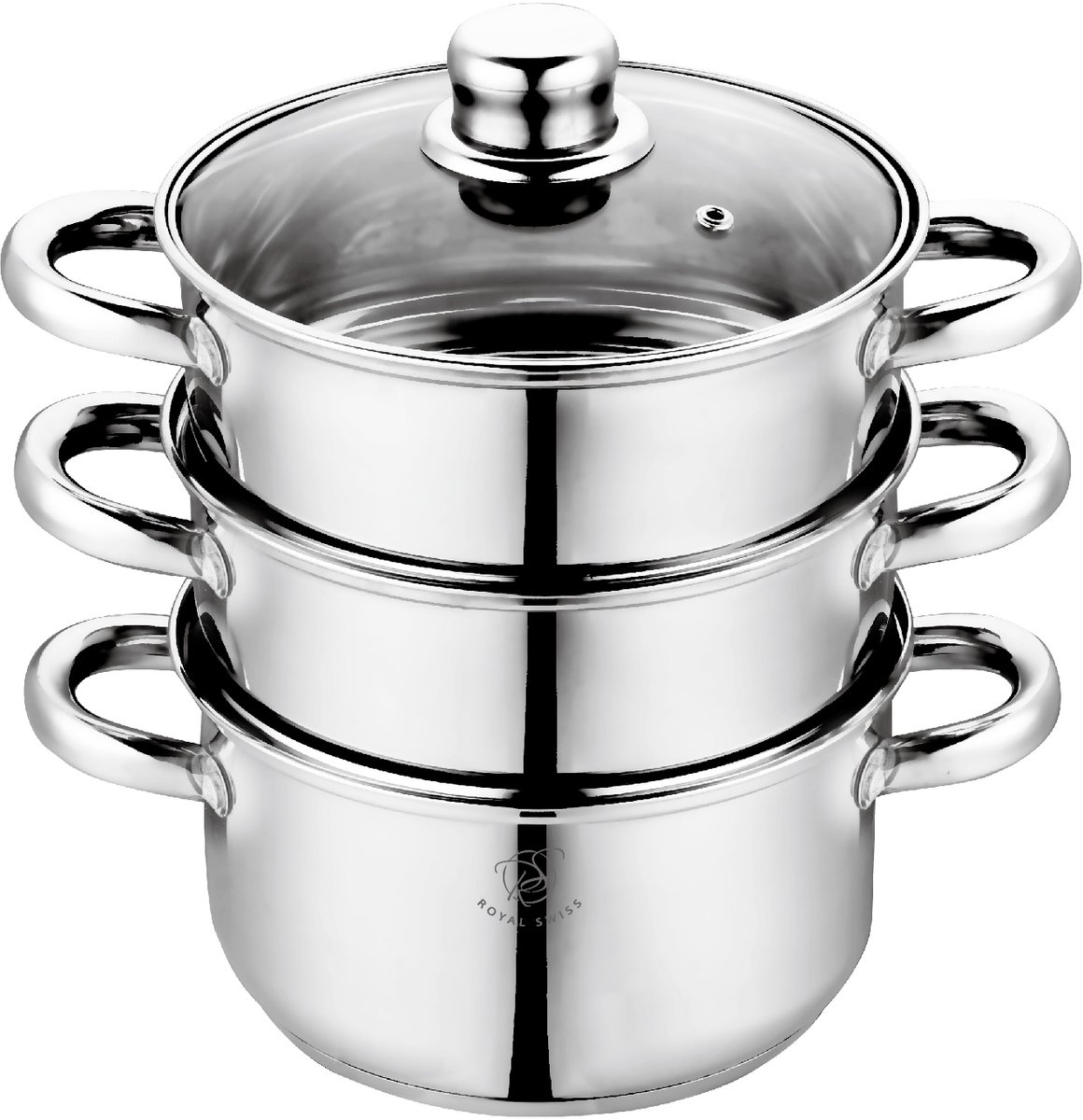 De Royal Swiss stoompan 22 cm is gebouwd uit hoogwaardig roestvrij staal (RVS), een materiaal dat bekend staat om zijn duurzaamheid, stabiliteit en eenvoudige reiniging. RVS is bovendien minder gevoelig voor verkleuring en geurt minder snel dan sommige andere materialen. Het totale ontwerp is gericht op efficiëntie: een kookpan onderaan, daarboven één of twee stoomniveaus (stoominzetten) en een glazen deksel met ventiel om stoomdruk te reguleren en kookvocht te laten ontsnappen.