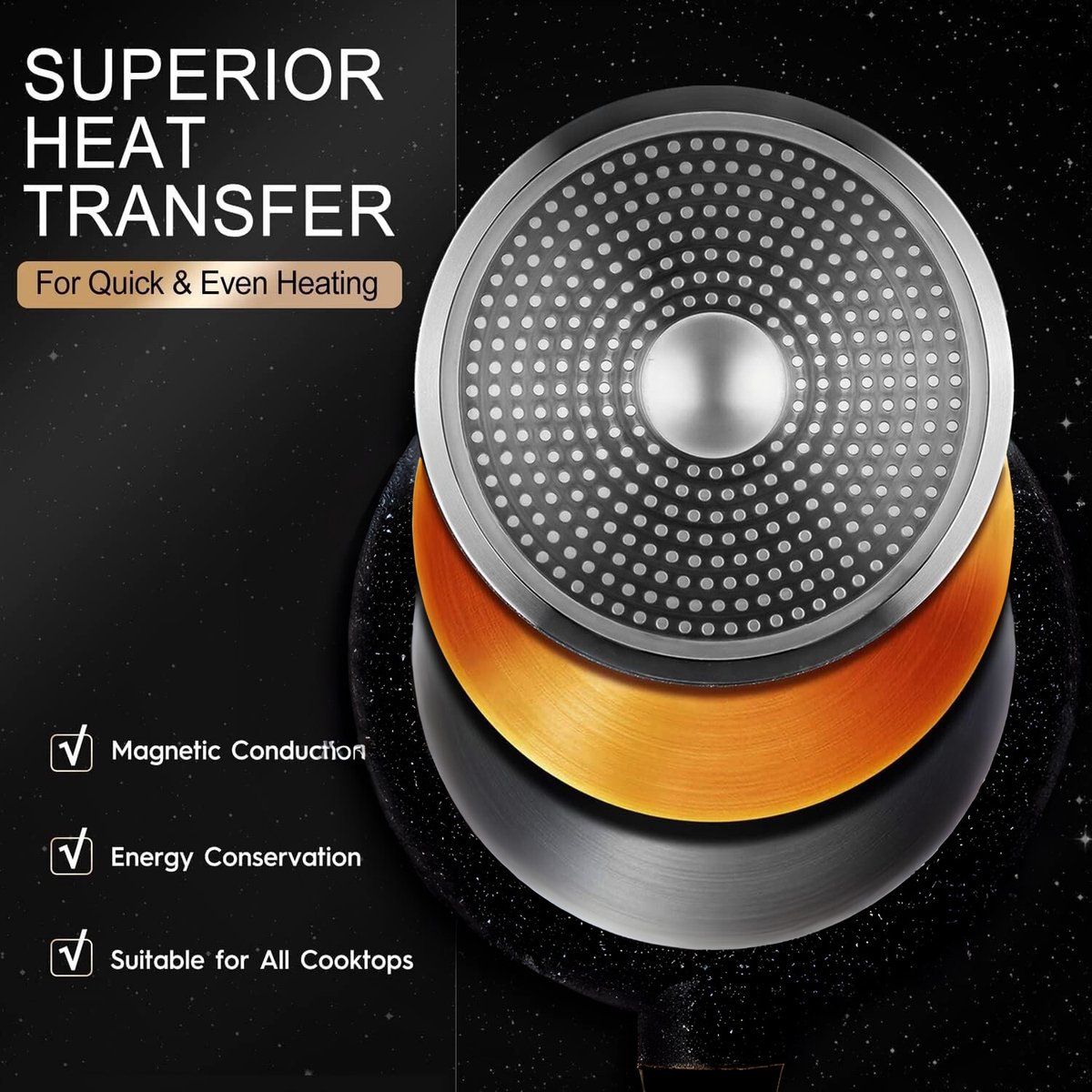 De pannen beschikken over een hoogwaardige inductiebodem die volgens de listing zorgt voor snelle opwarming en een gelijkmatige warmteverdeling. Dat helpt om voedsel gelijkmatig te garen en hotspots te voorkomen—handig bij het bakken van vlees of het zachtjes karameliseren van groenten.