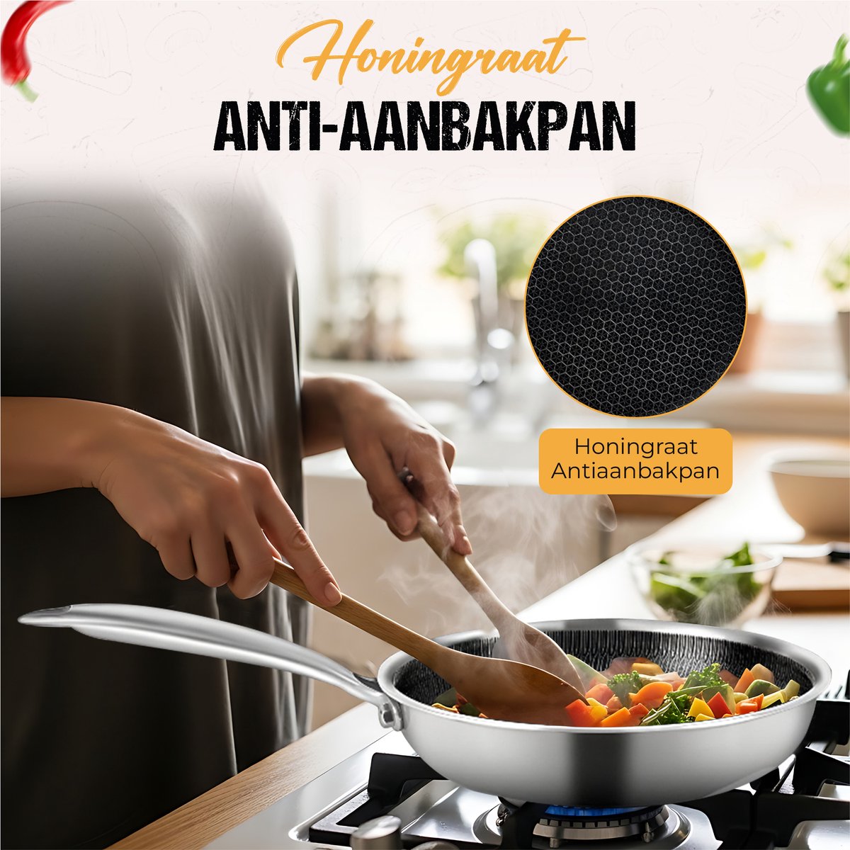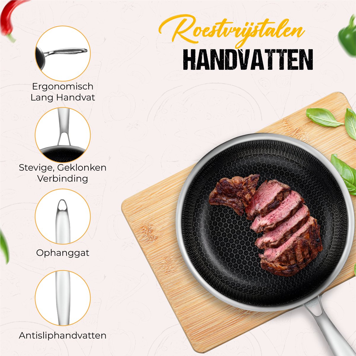 Deze pannenset combineert een roestvrijstalen (rvs) buitenzijde met een honingraatstructuur in de binnenkant. De rvs-bodem is bedoeld voor snelle en gelijkmatige warmteverdeling en compatibiliteit met verschillende warmtebronnen. De honingraatstructuur beschermt de anti-aanbaklaag en vermindert directe slijtage door spatels of reiniging, wat de levensduur kan verlengen.