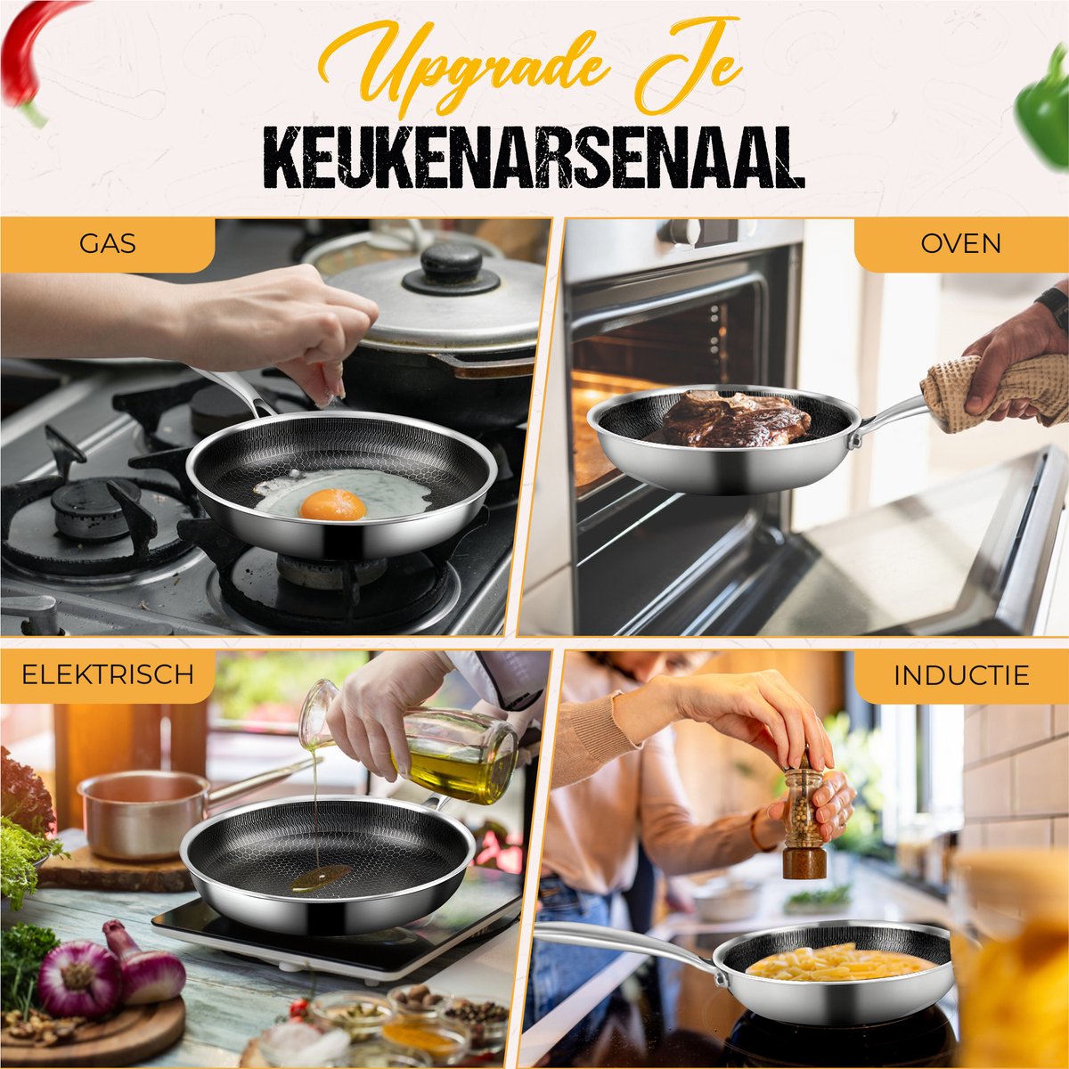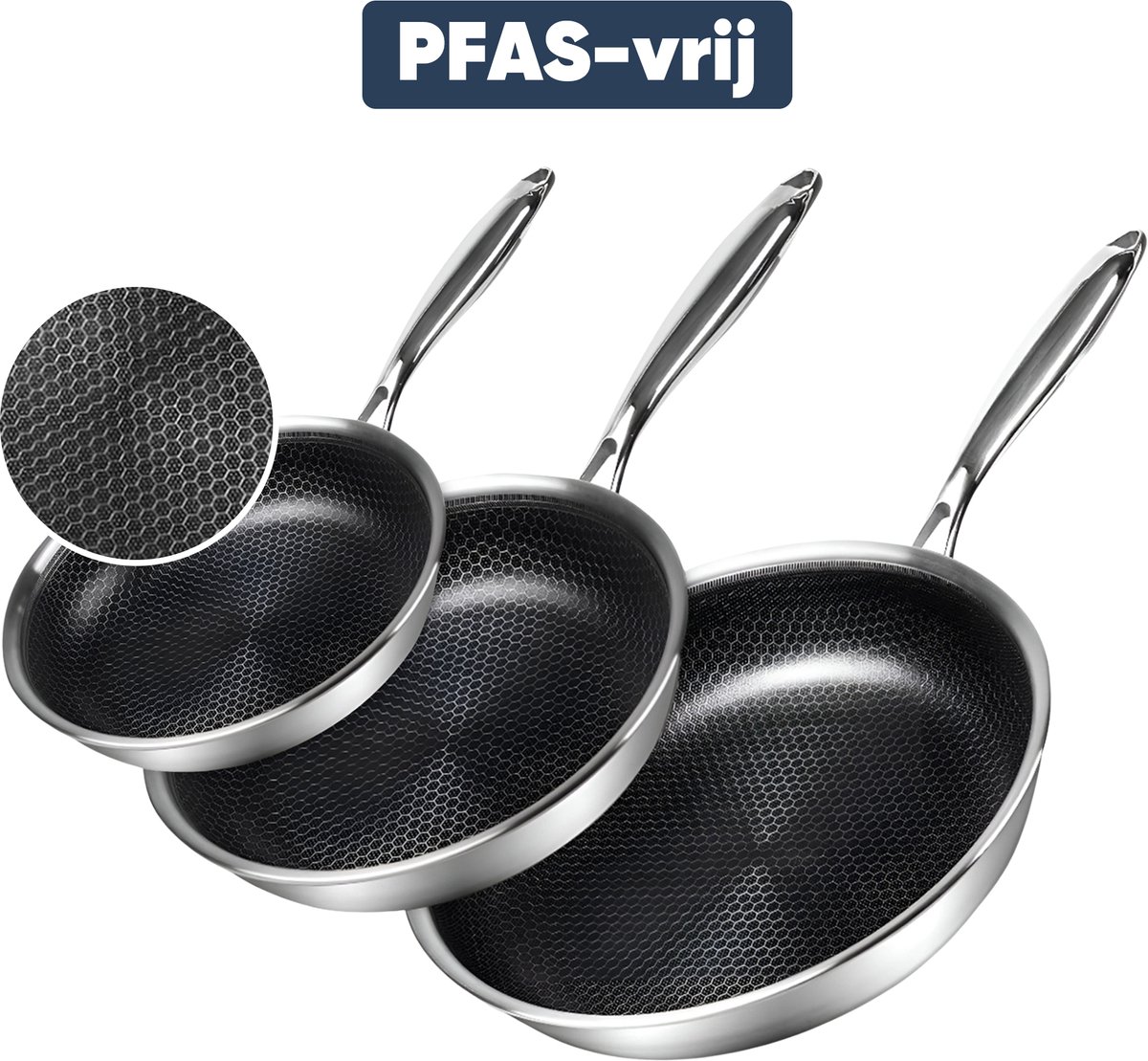 Overzicht:Deze 3-delige rvs honingraat koekenpannenset (Ø 20, 24, 28 cm) is een slimme pannenset inductie voor Nederlandse keukens, pfas-vrij en veelzijdig. De rvs-bodem zorgt voor snelle, gelijkmatige warmte, zodat je met weinig olie krokante resultaten bereikt.