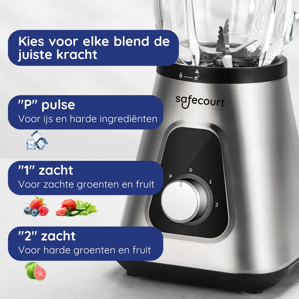 De Safecourt Kitchen Blender is een krachtige keukenblender met 1200 watt vermogen, een 1,5 liter glazen kan en een 600 ml meenembeker. Hij is ontworpen voor dagelijks gebruik: smoothies, soepen, shakes, ijs crushen en zelfs noten malen (bron: listing, gecontroleerd 2025).