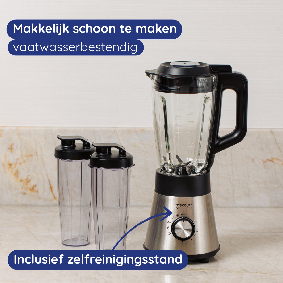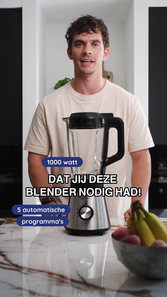 De Safecourt Blender is een krachtig en degelijk apparaat voor iedereen die dagelijks smoothies, soepen, noten en zelfs ijs wil verwerken zonder gedoe. Met een motor van 1300 watt, een ruime glazen kan van 1,5 liter en twee meeneembekers van 600 ml combineert hij brute kracht met praktische veelzijdigheid (bron: listing, gecontroleerd 2025). De bediening is eenvoudig dankzij vijf automatische programma’s, inclusief een eigen reinigingsstand.