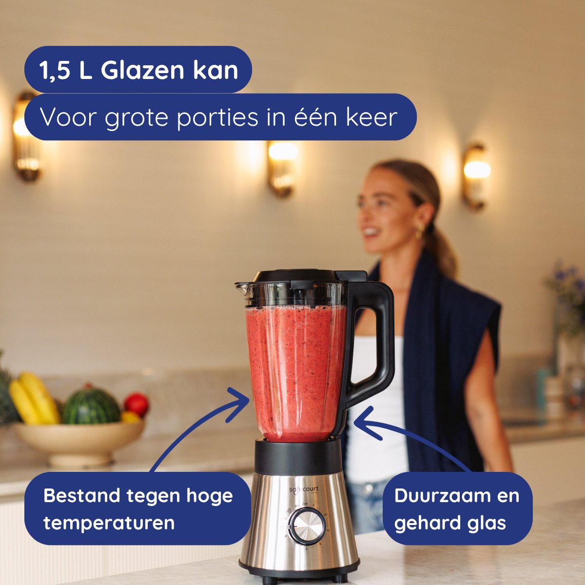 Ik heb echt heel lang gedaan over het vergelijken en uitzoeken van blenders. In eerste instantie had ik al voor deze gekozen maar er toch van af gezien omdat ik de communicatie met safecourt kitchen nogal als moeizaam heb ervaren tijdens mijn behoeft aan advies bij het maken van een keuze (tussen verschillende blenders van safecourt). Vervolgens een blender gekocht die een keer zo krachtig is (2000 w). Dat bleek een wel erg log apparaat met een plastic beker van 2 ltr. Die heb ik snel retour gezonden en toch maar deze besteld. Dat had ik dus meteen moeten doen. Ondanks de 1000 w doet het alles waar een blender voor mij aan moet voldoen. Bevroren fruit en koffiebonen worden moeiteloos verwerkt tot smoothie of filterkoffie. Bovendien is het apparaat een lust voor het oog. De elegante rvs-look met glazen kan staat prachtig op mijn aanrecht. Erg fijn dat je het messen deel uit de kan kunt schroeven. ook heel blij dat er speciaal voor koffiebonen een apart klein deel is en er niet een paar lepels koffiebonen in een veel te grote kan gemalen moet worden. Alles voelt heel degelijk aan door het solide motorische gedeelte en de stevige glazen kan. Ik heb echt heel lang over een keuze gedaan en ik ben ontzettend blij met deze. Absolute aanrader!