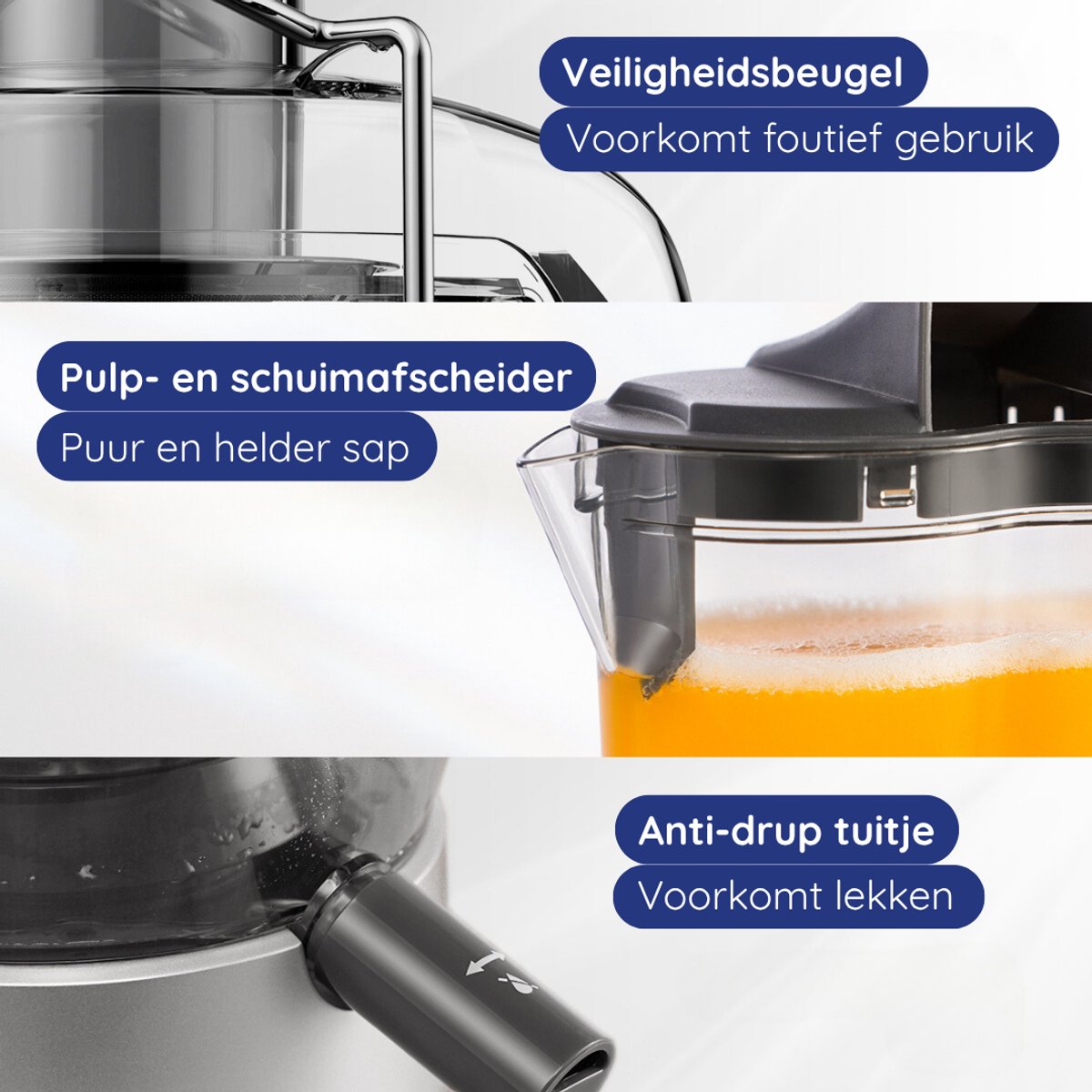Overzicht:De Safecourt Sapcentrifuge is een krachtige sapcentrifuge voor snel, vers sap thuis. Ideaal voor Nederlandse huishoudens die tijd willen winnen zonder snijwerk of schoonmaakgedoe. De 80 mm vulopening laat hele appels en wortels direct door.