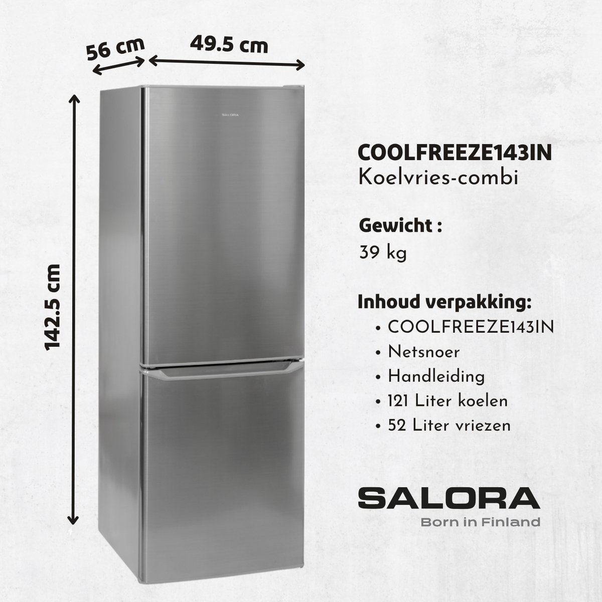 Overzicht:De Salora COOLFREEZE143IN is een koelvriescombinatie die gemak en rust in huis brengt voor Nederlandse huishoudens. Kies hem voor stille, energiezuinige koeling en een slimme indeling; totale inhoud 173 liter.