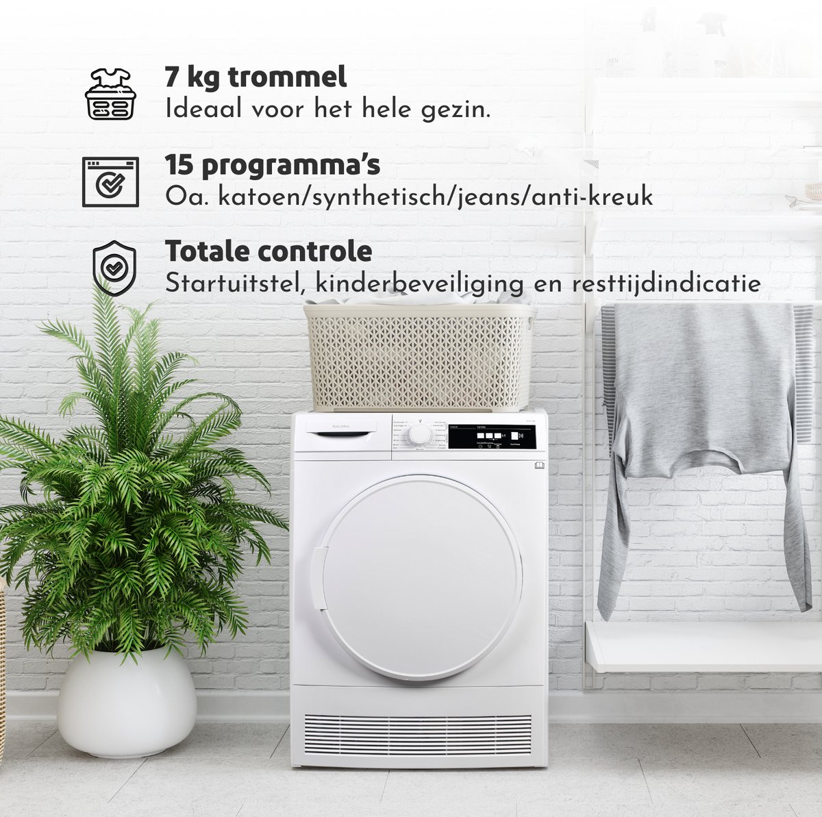 Deze 7 kg condensdroger is ideaal voor stellen en gezinnen die wekelijks meerdere droogrondes draaien en duidelijke bediening, overzichtelijke informatie en compacte plaatsing waarderen. Met een geluidsniveau van 65 dB en een katoenprogramma van circa 95 minuten (volgens de aanbieder) biedt hij een fijne balans tussen gemak en tempo, zonder poespas.