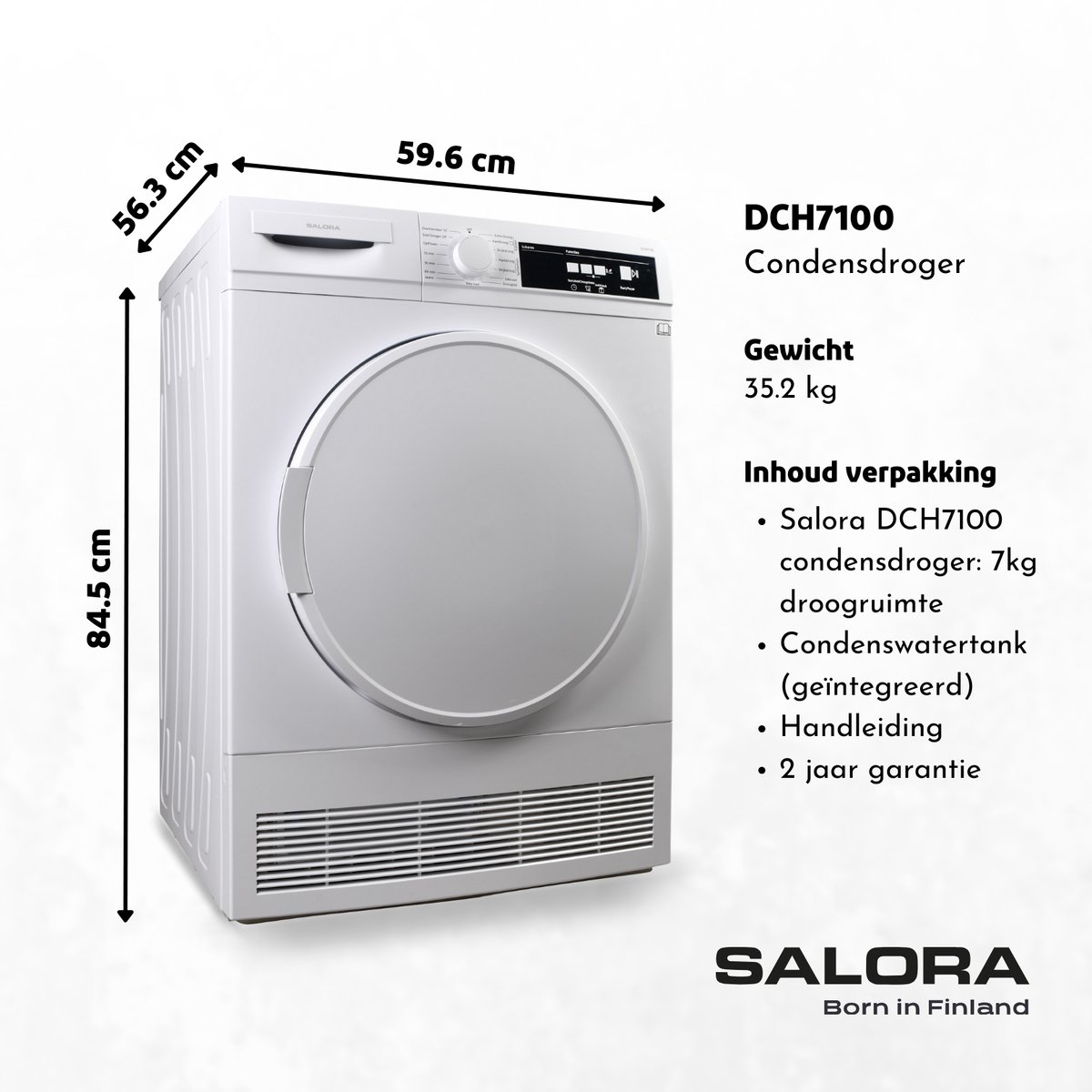 De Salora DCH7100 condensdroger maakt drogen eenvoudig voor Nederlandse huishoudens zonder afvoergedoe. Met 7 kg capaciteit en een geïntegreerd condensreservoir plaats je hem vrijstaand en leeg je simpel het water.