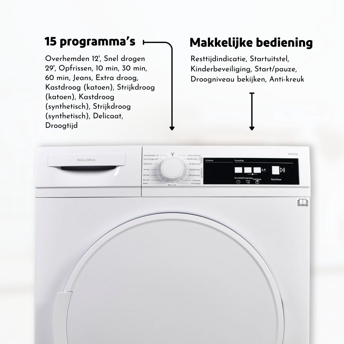 De Salora DCH7100 condensdroger is een vrijstaande 7 kg condensdroger met 15 programma’s, resttijdindicatie, startuitstel en kinderbeveiliging. Dankzij de geïntegreerde condenswatertank heb je geen vaste afvoer nodig, en met trommelverlichting zie je in één oogopslag of de trommel leeg is. Het is een praktische keus voor wie snel en eenvoudig wil drogen zonder gedoe met slangen.