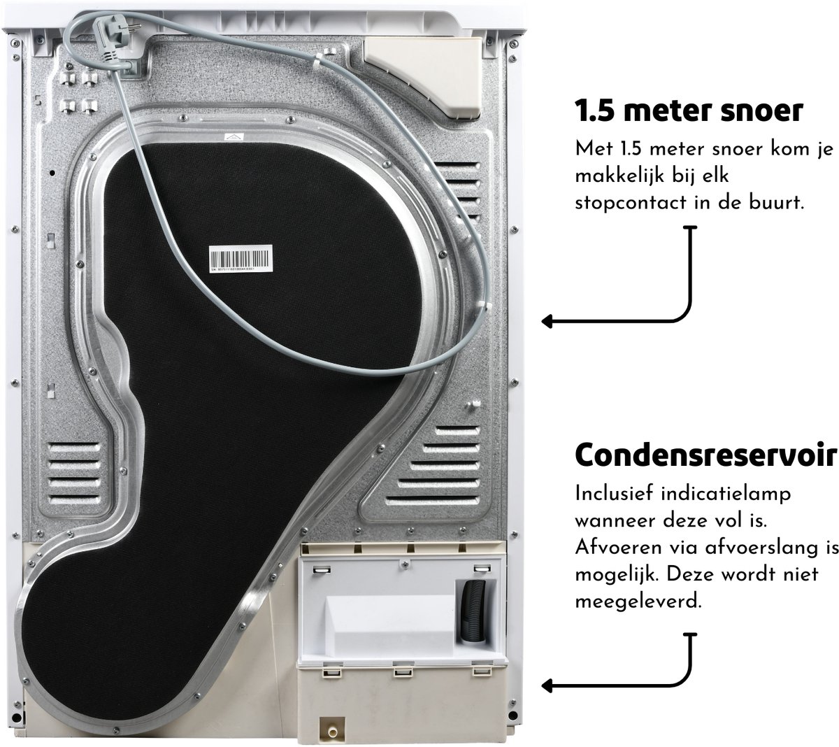 - Gewicht: Niet vermeld. Houd er rekening mee dat condensdrogers doorgaans stevig en stabiel zijn, maar til bij verplaatsen met twee personen.
