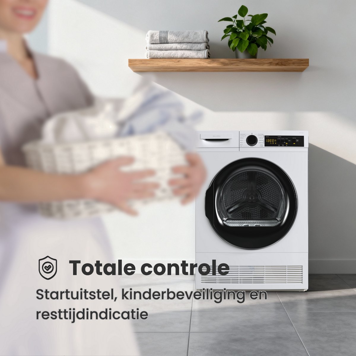 Het kinderslot (volgens de listing) voorkomt dat nieuwsgierige handen instellingen veranderen of een lopende cyclus onderbreken. In huizen met jonge kinderen geeft dit net dat beetje extra zekerheid. In de praktijk betekent dit: je stelt alles in, activeert het slot en de droger doet zijn werk zonder verrassingen.