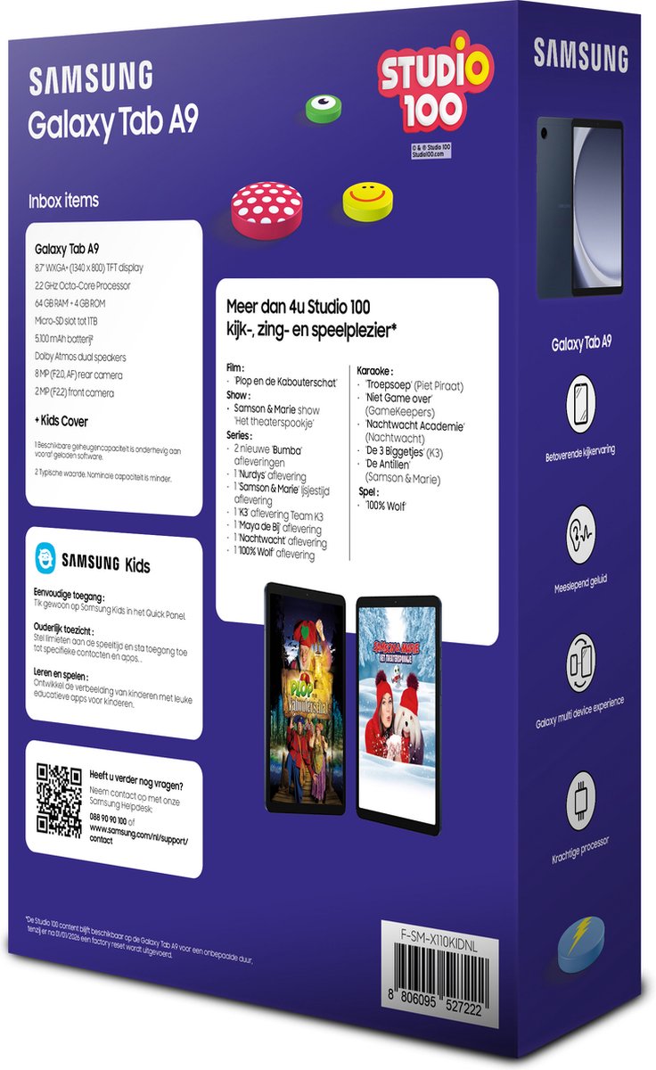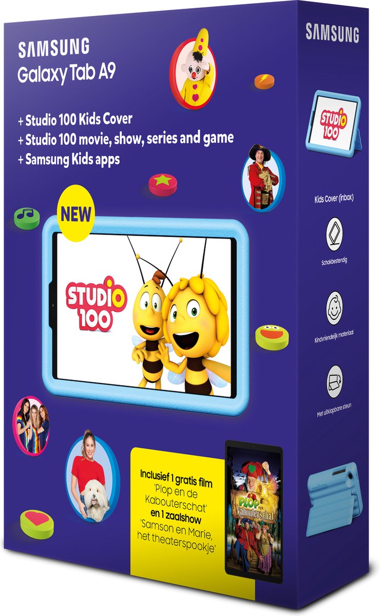 De bundel bevat de Studio 100 Kids hoes en vooraf geladen Studio 100-content zoals Team K3 en Plop en de Kabouterschat. Samsung Kids biedt ouderlijk toezicht, speel- en leermaterialen en tijdslimieten, waardoor de tablet veilig inzetbaar is voor jonge gebruikers.