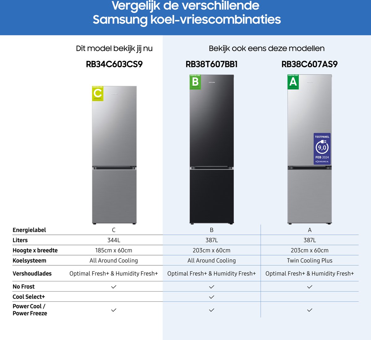 Overzicht:De Samsung RB34C603CS9/EF koel-vriescombinatie is een ruime en efficiënte keuze voor Nederlandse huishoudens die meer opbergruimte en minder onderhoud willen. Dankzij slimme koeling en energiebesparende functies houd je boodschappen langer vers, terwijl de netto inhoud van 344 liter ruim plek biedt.
