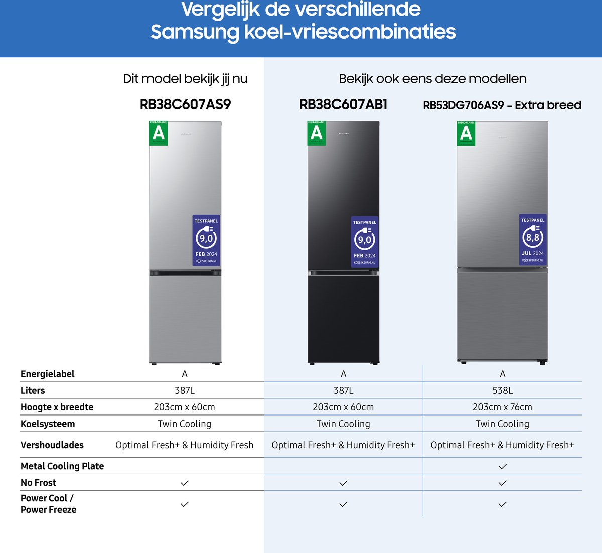 | Twin Cooling Plus houdt vers en vries gescheiden, met betere vochtigheid en minder geuroverdracht | Niet alle afmetingen/energielabelspecificaties zijn vermeld |