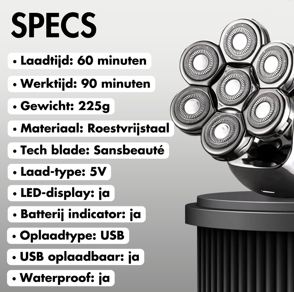 De SkullSharp PRO is gebouwd rond een robuust scheerhoofd met zeven roterende bladen. De materialen omvatten roestvrij staal (volgens de vermelding), met daaromheen kunststof behuizing. De unit weegt circa 225 gram; dat is stevig genoeg om stabiel in de hand te liggen, maar licht genoeg voor langdurig scheren van hoofd of baard zonder snel vermoeid te raken. Het compacte, ronde ontwerp met ergonomische handgreep maakt het mogelijk om je hand over de schedel te laten glijden met korte, cirkelvormige bewegingen. Dit is precies de manier waarop roterende scheerapparaten optimaal presteren.