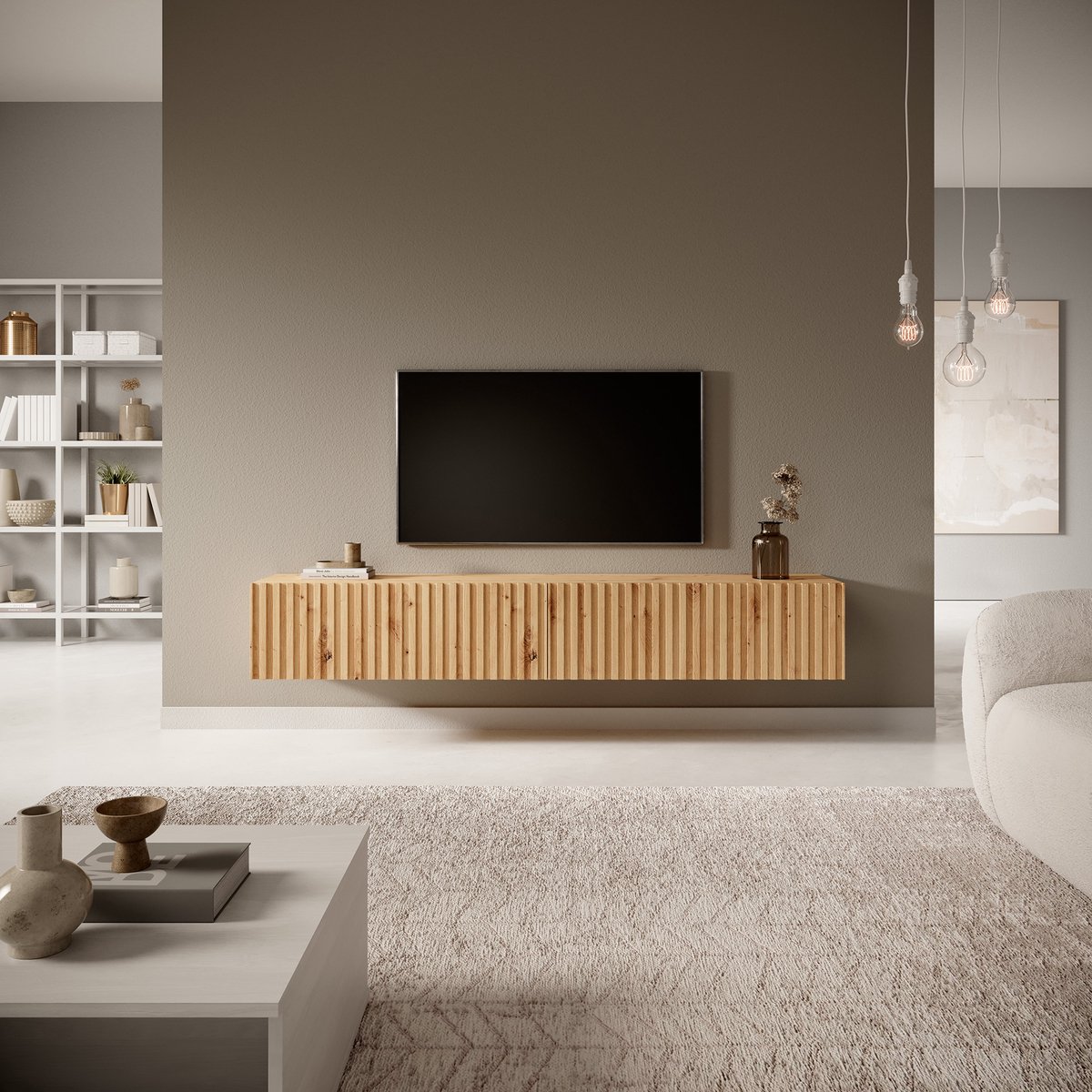 De Telire RTV kast is een hangend TV-meubel met een warme, natuurlijke uitstraling die vooral past bij boho- en botanische interieurs. Met zijn gefreesde fronten, matte afwerking en artisan eiken kleur biedt dit meubel zowel stijl als praktische opbergruimte voor je woonkamer.
