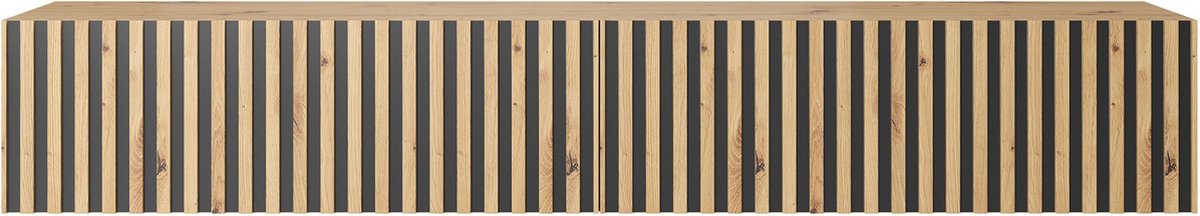 De Telire RTV kast is een hangend tv-meubel met een warme, natuurlijke uitstraling: artisan eik gecombineerd met zwarte accenten en een gefreesde voorkant met donkere strepen. Het meubel is ontworpen als een laag, breed dressoir dat onder een televisie geplaatst wordt en zowel zichtbare presentatie als opbergruimte biedt.