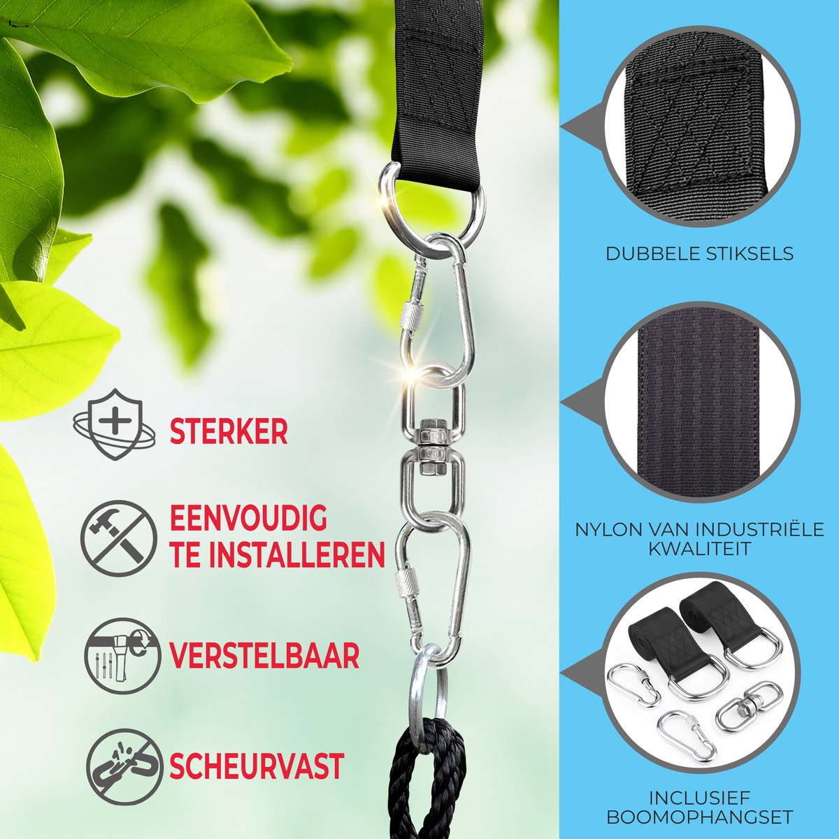 Ophangmateriaal Dikke gevlochten touw, metalen bevestigingen — ophangset en boomriemen meegeleverd