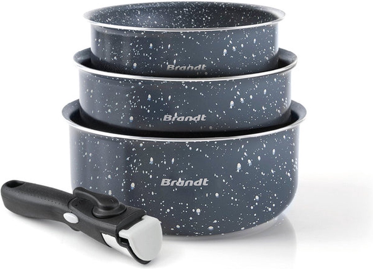 Specificaties: Set van 3 sauspannen met afneembaar handvat – Grijs marmer / Zwart review: ruimtebesparende anti-aanbak pannen