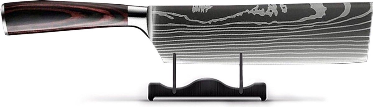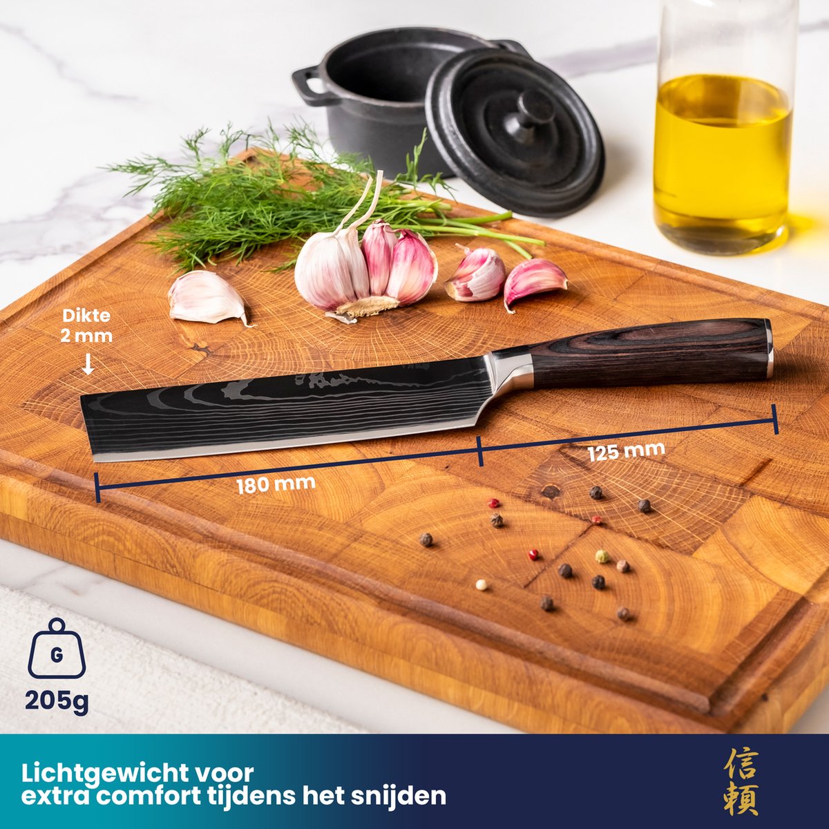 Dit is het Damascus Print Series Nakiri mes van Shinrai Japan: een vlijmscherp groentemes met een 18 cm lemmet, gesmeed uit Duits high carbon staal en afgewerkt met een kenmerkende damascus print. Het combineert Japanse vormgeving met Duitse degelijkheid, en is bedoeld voor wie veel en precies groenten snijdt — van ragfijne brunoise tot superdunne plakjes voor snelle wokgerechten.